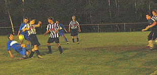 Ikiz Cemil, Tolla Vor dem Spiel war klar: beide Mannschaften mußten jeweils mit mindestens 2 Differenz Toren gewinnen, um an Türkspor Beerfelden vorbeizuziehen und damit in der Kreisliga spielen zu können. Es wurde eine gute und schnelle Begegnung. Zumindest in der 1. Hälfte bestimmte die JSG LW/Seckm/Haing das Geschehen auf dem Platz und erspielte sich ein halbes Dutzend hochkarätiger Torchancen. Der Gast ging nach einem Eckball mit 0:1 in Führung (10.). Trotzdem dauerte es bis zur 29.Minute ehe Ikiz der verdiente Ausgleich gelang. Vorangegangen war ein starkes Solo von Hillerich. Nach der Pause gestaltete die JSG Neustadt/Rimh/Breitenbrunn die Partie offener und ging wiederum in Führung (65./HE). Mit einer Energieleistung stellte Tolla in der 74. Minute den Ausgleich her. Obwohl beide Teams noch die eine oder andere Möglichkeit zur Resultatsverbesserung besaßen blieb es am Ende bei dem für beide Mannschaften unbefriedigenden 2:2. ![]() Martin Krauss (re) von der JSG LW/Seckm/Haingr ![]() Spielszene vor dem Tor der Gäste |