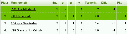 Bemerkung: Nachdem die JSG Lützelbach zum 3.Spiel in Steinbach nicht antrat (Spielermangel) wurde sie disqualifiziert.Alle bisherigen Ergebnisse der JSG wurden gestrichen |