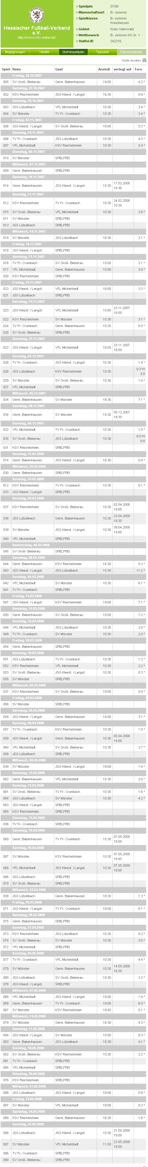28.10.07 JSG Lützelbach - VFL Michelstadt 3:4 Tore: Eigentor, Raitz, Amend So 04.11.07 TV Fränk. Crumbach - JSG Lützelbach 4:3 Tore: M.Schäfer, Raitz, Hillerich So 11.11.07 JSG Lützelbach - TG Ober-Roden 1:2 Mi 14.11.07 SV Münster - JSG Lützelbach 2:1 Fr 23. Nov 2007 JSG Erbach - JSG Lützelbach 9:1 So 2. Dez. 2007 JSG Lützelbach - KSV Reichelsheim ausgefallen So 9. Dez 2007 SV Groß-Bieberau - JSG Lützelbach Abbruch Pause bis 2. März 2008 So 2. März JSG Lützelbach - Germania Babenhausen ausgefallen Sa 8. März 2008 JSG Kleestadt/Schlierbach - JSG Lützelbach 11:2 So 16.2. März 2008 VFL Michelstadt - JSG Lützelbach 2:0 So 30.März 2008 JSG Lützelbach - TV Fränkisch-Crumbach 1:2 Tor: T. Kieser Di 8. April 2008 JSG Lützelbach - Germ. Babenhausen Ausgefallen siehe 23.April 2008 So 13. April 2008 JSG Lützelbach - SV Münster 4:2 So 20. April 2008 JSG Lützelbach - JSG Erbach 2:0 Mi 23. April 2008 JSG Lützelbach - Germania Babenhausen 1:3 Tor: S. Amend So 27. April 2008 KSV Reichelsheim - JSG Lützelbach 0:2 Tore: D. Raitz, S. Amend So 4. Mai 2008 JSG Lützelbach - SV Groß-Bieberau 3:3 Tore: T. Schäfer 2, F. Balonier Mi 21. Mai 2008 JSG Lützelbach - JSG Kleestadt/Langstadt 0:8 |