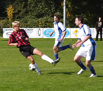 10. Aug 2008 10.30 Uhr JSG Erbach - JSG Seckmauern 0:3 Tore: Gessner 2, Tarhan Weitere Paarungen: TSG Steinbach - JSG Zell/MlgGr/Kön 0:5 TV Fr.Crumb - SG Sandbach 1:2 JSG Hetzb/Günterf I - KSV Reichelsheim 3:1 JSG Hetzb/Günterf II - JSG Hainst/Lützelb 0:4 JSG Rimh/Neust/Breit - TSV Höchst 9:2 JSG Zell/MlgGr/Kön II - JSG Sensb/Kailb 6:7 JSG Rothen/Finkenb - VfL Michelstadt 0:8 3. Sept 19 Uhr JSG Seckmauern - JSG Hainst/Lützelbach 3:1 Tore: Kumpf 2, Maslum Weitere Paarungen: JSG Zell/MlgGr/Kön - JSG Sensb/Kailb 4:1 VfL Michelstadt I - JSG Hetzb/Günterf I 0:2 JSG Rimh/Neust/Breit - SG Sandbach 1:2 So 5. Okt 2008 10.30 Uhr JSG Zell/MGr/Kön - JSG Seckmauern 3:1 ![]() Tor: Mazlum Zell begann gut und führte nach knapp einer halben Stunde verdient mit 2:0. Danach ließ Zell nach, Seckmauern kam auf und Maslum verkürzte. Wenig später hatte Kumpf Pech mit einem Pfostenschuß, eine weitere Großchance zum Ausgleich blieb ebenfalls ungenutzt. Nach dem Wechsel erhöhte Zell schnell auf 3:1. Davon erholte sich Seckmauern nicht mehr. Der Sieg der Hausherren ging vollauf in Ordnung, zumal diese der JSG läuferisch und spielerisch klar überlegen waren. Seckmauern konnte gegen Ende des Spiels nichts mehr zusetzen. Auf dem Bild spielt Kevin Schmauß (re) einen Paß auf Tom Kieser. SG Sandbach - JSG Hetzbach/Günterfürst I 6:7 Sa 18. Okt 2008 13.30 Uhr JSG Hetzbach/Günterfürst I - JSG Zell/MGr/Kön 3:4 |