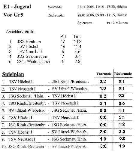 Dez 2005 Silvesterturnier in Bad König TSG Bad König1 - JSG Seckmauern/Haingrund 4 - 0 SV Ltz.Wiebelsbach - JSG Seckmauern/Haingrund 4 - 2 JSG Seckmauern/Haingrund - FV Mlg.Grumbach 1 - 1 TSV Günterfürst - JSG Seckmauern/Haingrund 2 - 0 TSG Zell - JSG Seckmauern/Haingrund 2 - 2 Tore Maximillian Reitz 2 X Marcel Nauheimer 2 X Mikail Güney 1 X Nur 6 Spieler ohne Auswechselspieler Haben sich Tapfer geschlagen u gute Spiele gezeigt. (Paul Wölfenschneider) |