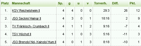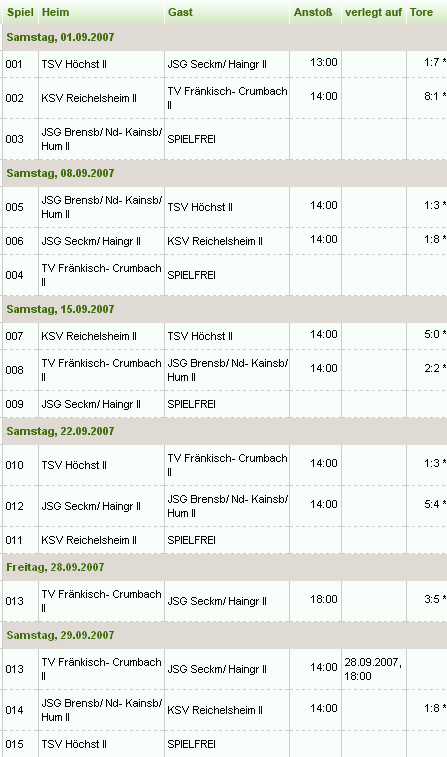 1. Sep 2007 13 Uhr TSV Höchst II - JSG Seckm/ Haingr II 1:7 Tore: Calvin Tarhan 3, Philipp Beck 2, Kevin Kestler 2 Sa 8. Sept 2007 14 Uhr JSG Seckm/ Haingr II - KSV Reichelsheim II 1:8 Tor: Philipp |