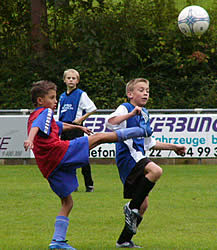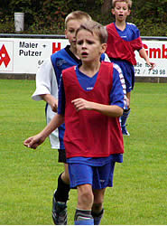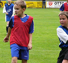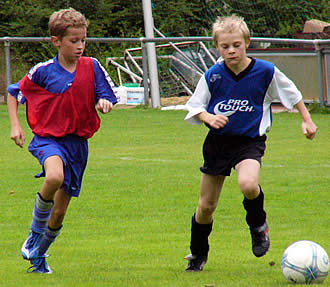 ![]() Bild rechts: Keine Gelegenheit sich auszuzeichnen hatte unsere E2 gegen Reichelsheim: man verlor mit 1:8. Hier versucht Kevin (li) seinem Gegenspieler zu folgen. |