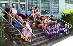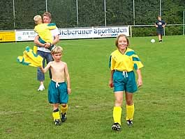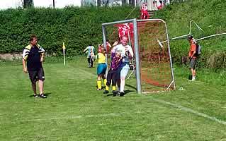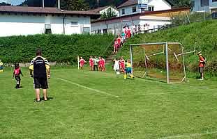 17.08.02 12:30 Uhr TSV Höchst 2 - JSG Seckmauern 2:3 (1:2) Tore: Elena Martin 2, Sammy Ercan In einem spannenden Spiel zweier gleichwertiger Mannschaften gewann Seckmauern am Ende glücklich mit 3:2. Glücklich deshalb, da Höchst ein Chancenplus hatte und in der zweiten Hälfte sogar einen Strafstoß vergab. Kurios und witzig dabei: unser Torwart "weigerte" sich bei dem verhängten 7m ins Tor zu gehen. Da half auch das Zureden von Betreuer, Vater und Schiedsrichter nichts. Elena Martin stellte sich dann als Torfrau zur Verfügung und parierte den Strafstoß. Auf Grund der vielen Auswechselspieler (5) war Betreuer Wolfgang "Paul" Keller gezwungen dauernd zu wechseln. Dies machte sich natürlich negativ auf den Spielfluß bemerkbar. In beiden Mannschaften waren jeweils 2 Mädchen die besten Spieler: bei Seckmauern war dies Elena Martin. Der Rest überzeugte durch großen Kampfgeist.