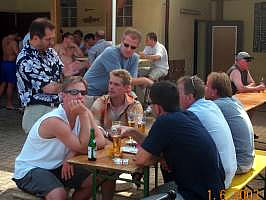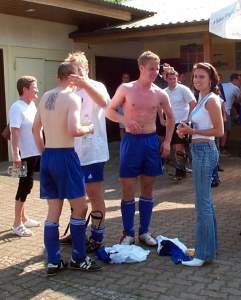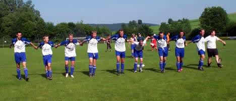 TSV Seckmauern - KSV Urberach 8:1 (2:1) 07.Min 0:1 14.Min 1:1 M.Krejtscha 27.Min 2:1 Eigentor 48.Min 3:1 M.Seifert (HE) 57:Min 4:1 B.Löffler 64.Min 5:1 I.Singer 85.Min 6:1 M.Krejtscha 88.Min 7:1 M.Seifert 90.Min 8:1 M.Seifert Bei brütender Hitze gewann der TSV Seckmauern auch in dieser Höhe verdient mit 8:1 gegen den harmlosen Gast aus Urberach, der vor dem Spiel schon als Absteiger feststand. Während sich unsere Mannschaft in der zweiten Spielhälfte enorm steigerte, konnte Urberach dagegen in dieser Phase überhaupt nicht mehr gegenhalten. In den ersten 15 Minuten schien sich ein müder Sommerkick anzubahnen. Fehler hüben wie drüben. Nach einem guten Paß in die Tiefe fiel in der 7.Min überraschend das 0:1 für die Gäste. Andy Schreiber, der das Tor für Markus Schäfer hütete, war machtlos. In der 12.Min wurde Seifert freigespielt, anstatt jedoch selber zu schießen gab dieser ab zu Krejtscha, der dann das Leder über das Gehäuse drosch. Der Ausgleich fiel 2 Minuten später, als M.Walther Krejtscha anspielte, dieser seinen Gegenspieler umkurvte und zum 1:1 einschoß. Die 2:1-Führung in der 27.Min kurios: Ingo Singer drang in den Strafraum ein, schoß den Torwart an, von diesem prallte der Ball zu einem Abwehrspieler und von dessem Körper ins Tor. Dazwischen hatte auch Urberach einige vielversprechende Chancen, die sie aber allesamt nicht nutzen konnten. In der 35.Min spielte sich Jens Billinger gut durch, kam noch frei zum Schuß, schoß aber vorbei. Gleich zu Beginn der zweiten Halbzeit unterlief einem Gästeabwehrspieler ein Handspiel, den fälligen Elfmeter verwandelte Seifert zum 3:1 (Innenpfosten, Tor, 48.). Ab diesem Zeitpunkt hatte Urberach überhaupt keine Chance mehr und das Spiel entwickelte sich zu Einbahnstraßenfußball mit Scheibenschießen: fast jeder durfte es mal probieren. Oft wurde dabei jedoch der besser postierte Nebenmann übersehen. In der 54. Min hatte Singer eine Chance, schoß jedoch vorbei. Dann endlich das Tor unseres Torjägers: Seifert zirkelte einen Freistoß genau auf die Stirn von B.Löffler - 4:1 (57.). Danach folgten die "Wilden 60iger": Chancen im Minutentakt ab Minute 60. Die besten davon: einen Foulelfmeter schoß Löffler so unplatziert, daß der Torwart abwehren konnte (60.). Für das vorangegangene Foulspiel an Seifert erhielt der Gästespieler die gelb/rote Karte. In der 62. Min war Jens frei vorm Tor, der Torwart parierte großartig. Dann das 5:1 in der 64.Min durch Singer nach Doppelpaß mit Krejtscha. 2 Minuten später gleich 3 Chancen zum Einschuß durch Seifert, Löffler und Singer. In der 70.Min war Billinger in halbrechter Position frei vor dem Tor und schoß den Torwart an; besser wäre es gewesen zu den freistehenden Löffler oder Seifert zu passen. In den letzten 10 Minuten fielen dann noch drei Tore: 85.Min 6:1 durch einen Freistoßtrick, Krejtscha erzielte das Tor aus der Drehung 88.Min 7:1 Seifert, freigespielt von Löffler 90.Min 8:1 Seifert, Löffler trickst sich an der Außenlinie fest, der Ball kommt irgendwie zu Seifert, der ebenfalls aus der Drehung einschießt.