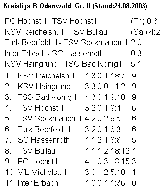 24.08.2003 ![]() Türk Beerfelden 1b - TSV 1b 2:0 (2:0) Aufgrund einer indiskutablen ersten Halbzeit verlor man zu recht bei den Türken. In der 2. Hälfte konnte man mehr zeigen, doch es reichte nicht zu einem Treffer. Die Tore bei Türkspor schossen deren Spielertrainer Ari Ayhan und ein weiterer Ex-Erstmannschaftsspieler Zafer Ötztürk.