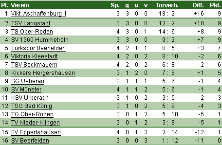 Donnerstag, 26.08.04 18.30 Uhr SV Münster - TSV Seckmauern 1:0 FV Eppertshausen - TS Ober-Roden 0:5 Türk Beerfelden - SV Vikt. Kleestadt 2:3 Stand: 26.08.04 ![]() SV Münster - TSV Seckmauern 1:0 (0:0) Tor: 1:0 Adena (76.) Mannschaftsaufstellung TSV Seckmauern Markus Schäfer, Brohm (83., Wolfstädter), Bätz, Kisslinskiy, Burak (78., Billinger), J. Stier, M. Seifert, Singer, Olt, A. Stier (63., B. Canbolat), Krejtscha gelbe Karte: Kisslinskiy (87.) Fußballspiele auf dem Hartplatz haben seit jeher