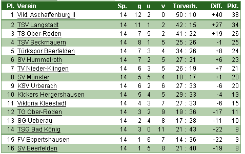 Ober-Roden – TSG Bad König 5:3 (0:0) (aus DE vom 8.11.04) Kleestadt trotzt Tabellenführer Aschaffenburg Bezirksliga Ost: Später Ausgleich der Viktoria zum 2:2 – Turbulente zweite Hälfte bei der TG Ober-Roden Viktoria Aschaffenburg II – Viktoria Kleestadt 2:2 (1:2) Der Gast zeigte eine gute Partie und führte nach einem Eigentor (28.) und dem Treffer von Schäfer (32.) verdient. Es sah nach einer Überraschung aus. Dann aber wachte Aschaffenburg auf, Neumann (37.) markierte den Anschluss. Nach der Pause spielten nur noch die technisch überlegenen Platzherren, die glücklich durch Kolak (82.) ausglichen. TV Nieder-Klingen – FV Eppertshausen 5:0 (2:0) Der FVE stellte sich wie ein Absteiger vor. Der TV Nieder-Klingen war in allen Belangen überlegen und siegte auch in der Höhe verdient nach Treffern von Hotti (37./38./73.), Jünger (55.) und Beilstein (70.). TSV Langstadt – Türk Beerfelden 6:2 (4:0). Im ersten Durchgang dominierte der TSV und ließ dem Tabellenvierten keine Chance. Nach Wiederbeginn wurden die Spieler angesichts des klaren Vorsprunges unkonzentriert, nachlässig. Türk steigerte sich, und der TSV fing sich so Tore von Köse (60./85.) ein. Kurzmann (65., TSV) sah noch Rot. Für den TSV waren T. Rödler (9./15.), Tajjiout (40./48.), Elghazouani (41.) und Lau (90.) erfolgreich. TG Ober-Roden – TSG Bad König 5:3
