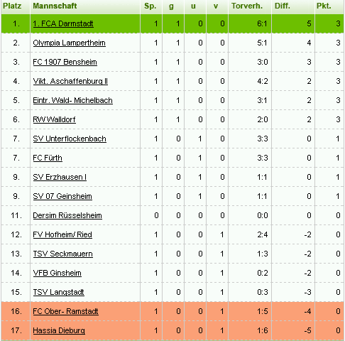 nach Maß für den FCA Darmstadt FCA Darmstadt – Hassia Dieburg 6:1 (2:0). Einen Start nach Maß hatten die Darmstädter und gingen durch Hosseini (4.) schnell in Führung. Danach verlief die Partie bis zur Pause ausgeglichen, auch wenn Neuzugang Fleck (32.) für den FCA auf 2:0 erhöhte. Nach der Pause hagelte es gegen die Gäste Gelb-Rot: Dennis und Marc Klein (57./66.) sowie Herzig (83.) mussten vorzeitig vom Platz, auf der anderen Seite traf es Weiland (62.). Derart dezimiert, hatte Dieburg nichts mehr zu bestellen. In der Folge schraubten Hosseini (63.), Klöber (67.), Hunzicker (87./Foulelfmeter) und Akbulut (90.) das Ergebnis in die Höhe, Daniel Rödler (75.) verkürzte zum 1:4. FC Bensheim – TSV Langstadt 3:0 (1:0). Zunächst hielt Langstadt gut mit. Pech hatte Schäfer mit einem Pfostenschuss (20.). Dann übernahmen die Bergsträßer das Kommando. Die Folge war das 1:0 durch Wanitschek (30.). Nach der Pause hatte Langstadts Spielertrainer Sönmez den Ausgleich auf dem Fuß, scheiterte aber. Das passierte auf der anderen Seite Richter: Er scheiterte mit einem Foulelfmeter (57.) an TSV-Torwart Sascha Africh. Erfolgreicher waren Fischer (64.) und Trautmann (85.), die zum leistungsgerechten 3:0-Sieg trafen. SV Erzhausen – SV Geinsheim 1:1 (0:1). Bereits am Freitag traf Landesliga-Absteiger Erzhausen auf Geinsheim, das durch Giorla (4.) in Führung ging. Erzhausen tat sich lange Zeit schwer, hatte am Ende aber das Glück des Tüchtigen. Kurz vor dem Abpfiff gelang Schwarz der Ausgleich. Olympia Lampertheim – FC Ober-Ramstadt 5:1 (3:0). Bereits nach einer knappen halben Stunde und dem Hattrick von Lampertheims Michael Gärtner (11./20./25.) war die einseitige Partie entschieden. Lampertheim war dem FCO in allen Belangen überlegen. Nach der Pause steckten die Gastgeber etwas zurück. Dennoch erhöhten Müller (75.) und De’Angelis (75.) auf 5:0, ehe Grillo (78.) verkürzte. |