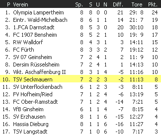 Freitag, 07.09.2007 20 Uhr Eintr. W.-Michelbach - Vikt. Aschaffenburg 1B 4:0 Samstag, 08.09.2007 15 Uhr FV Hofheim - 1. FCA Darmstadt 2:2 SV Erzhausen - FC Fürth 2:5 FC Bensheim - RW Walldorf 0:0 Hassia Dieburg - Olympia Lampertheim 1:2 Sonntag, 09.09.2007 15 Uhr TSV Seckmauern - Dersim Rüsselsheim 3:1 SV Geinsheim - FC Ober-Ramstadt 1:1 TSV Langstadt - Spielfrei Stand: 09.09.07 ![]()