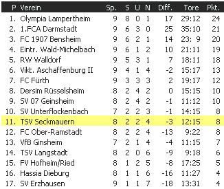 Samstag, 15.09.2007 15 Uhr VFB Ginsheim - SV Geinsheim 3:0 Olympia Lampertheim - FC Bensheim 0:4 Sonntag, 16.09.2007 15 Uhr 1. FCA Darmstadt - FC Fürth 5:0 RW Walldorf - Eintr. W.-Michelbach 4:0 Vikt. Aschaffenburg 1B - SV Erzhausen 4:1 FV Hofheim - SV Unterflockenbach 4:6 FC Ober-Ramstadt - TSV Seckmauern 2:1 Dersim Rüsselsheim - TSV Langstadt 1:2 Hassia Dieburg - Spielfrei Stand: 16.09.07 ![]()