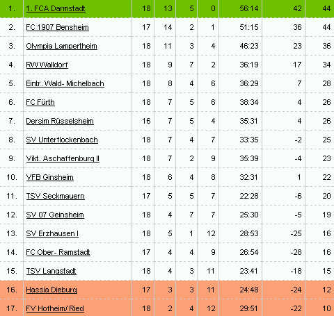 Cabezas (35.), 2:0 Gärtner (72.). FC Olympia Lampertheim: Neudahm, Müller, Schader, De Angelis, Amallah, Ekin (ab 82. Krastel), Schaaf (abb 70. Gärtner), Piechel, Cabezas, Hofsäß, Simon (ab 57. Bopp). Tore: 1:0 Cabezas (34.), 2:0 Gärtner (73.). – Schiedsrichter: Faulhaber (Bad Homburg). – Zuschauer: 100. – Beste Olympia-Spieler: Schader, Cabezas. Kritik