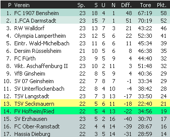 Löffler), Olt, Krejtscha, Thiel, Seifert. Zuschauer: 180. In den ersten 45 Minuten boten beide Mannschaften auf dem kleinen Platz ein ausgeglichenes Kampfspiel. Pech hatte der TSV in der 26. Minute bei einem Pfostentreffer von Christian Verst. RW-Schlussmann Marcel Anton verhinderte durch seine schnelle Reaktion einen anschließenden Nachschuss. In erster Linie konzentrierten sich beide Teams allerdings auf die Defensivarbeit, um einen Gegentreffer zu verhindern. Nach der Pause war Walldorf spielbestimmend und hatte einige gute Möglichkeiten. Der Tabellendritte spielte nun auch mit höherem Tempo, wodurch die Hausherren Probleme bekamen. Pech hatte Rot-Weiß bei zwei Pfostentreffern von Murat Hiyamlioglu (55.) und Alejandro Varela (60.). In der von den Gästen überlegen gestalteten Phase traf Seckmauern durch Marcus Krejtscha (64.) nur die Querlatte. Die Basis für den verdienten Erfolg legte RW-Coach Sempruch mit der Einwechslung von Patrick Balan (61.), der vier Minuten später per Abstauberlupfer aus kurzer Distanz nach abgewehrtem Schuss Ünals den Siegtreffer erzielte. Bereits beim 3:2 über Langstadt hatte Sempruch mit Eyüp Demirel den späteren Siegtorschützen eingewechselt. „Ein glückliches Händchen des Trainers“, freute sich RW-Sprecher Manfred Knacker. Beim einzigen Stellungsfehler in der Abwehr sah Marlon Locke nach einer Notbremse spät noch die Rote Karte. RW Walldorf: Anton – Becker, Baaden, Varela, Garofalo, Bogdanovic, Ünal, Locke, Demirel (61. Balan), Hiyamlioglu (75. Biedenbach), Schuster (75. Salzmann). Tor: 0:1 Balan (65.). Rote Karte: Locke (89./Walldorf). Schiedsrichter: Wüst (Griesheim), Zuschauer: 250. |