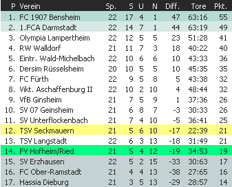 Lampertheim - TSV Seckmauern 0:0 Olympia Lampertheim: Neudahm, Pineker, Schader, De Angelis (ab 68. Schaaf), Amallah, Scholl, Gärtner, Ekin (72. Semon), Cin, Hofsäß, Burosch (ab 75. Müller)