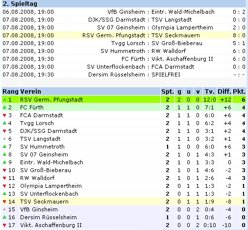 ![]() Germ. Pfungstadt - TSV Seckmauern 8:0 (5:0) 1:0 Böck (2.), 2:0 Böck (9.), 3:0 Köksal (12.), 4:0 Hadi (14.), 5:0 Schmidt (42.), 6:0 Böck (65.), 7:0 Meissner (68.), 8:0 Hadi (90.) TSV