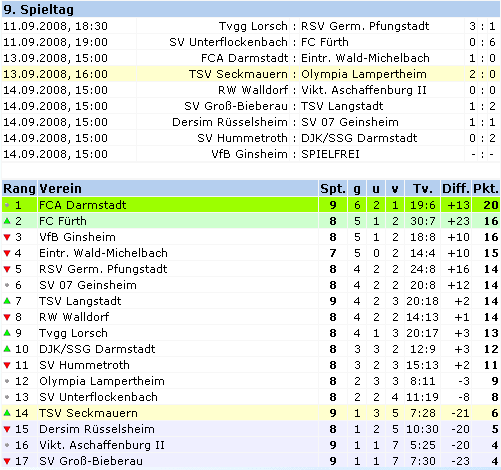 aus echo-online.de) Doch danach sah es lange Zeit nicht aus, denn von Beginn an waren die Gäste besser. Sie spielten einen klugen und schnellen Ball, waren ständig in Bewegung und immer einen Tick schneller als die verunsichert wirkenden Platzherren, denen man den verkorksten Saisonstart sichtlich anmerkte. So entsprang die erste Großchance die Bergsträßer fast schon zwangsläufig, doch bei der Eins-zu-Eins-Situation im Strafraum mit Olympia-Sturmführer Michael Gärtner war TSV-Keeper Markus Schäfer auf dem Posten (8.). Seckmauern hatte große Abstimmungsprobleme in der Abwehr mit den rochierenden Angreifern der Lampertheimer. Deren Chancen häuften sich. Fast im Minutentakt waren die Möglichkeiten der Gäste zu notieren: Schäfer klärt mit Fußabwehr zur Ecke (12.) und 60 Sekunden später war er wieder Sieger gegen den durchgebrochenen Torjäger Gärtner, der allein an diesem Tage seine Elf zum Sieg hätte schießen können. Christian Hofsaess scheiterte danach ebenso an dem TSV-Keeper (15.), wie auch weitere gute Einschussmöglichkeiten der Lampertheimer ungenutzt blieben. Der Gast blieb zwar tonangebend, doch irgendwie schien sich jetzt ein Hauch Überheblichkeit einzuschleichen, was auch in der fahrlässigen Chancenverwertung der Olympia zum Ausdruck kam. So zum Beispiel, als der aufgerückte Innenverteidiger Sergej Pineker einen Kopfball über das Tor setzte (43.) – die letzte Aktion vor der Pause. In dieser schien der Seckmaurer Coach Theo Sahm die richtigen Worte gefunden zu haben. Mit Engagement und vor allem der jetzt sichtbaren Körpersprache war nun die Heimelf präsent, gestaltete die stets faire Partie offen. Aber wieder hatten die Bergsträßer die ersten Möglichkeiten, aber wieder war Gärtner ohne Fortune, als er nur um Zentimeter verzog (59.) und auch kurze Zeit danach mit dem Kopf das Ziel knapp verfehlte (63.). Keine 120 Sekunden nach den Großchancen der Gäste hatten auch die Odenwälder ihre erste gute Gelegenheit: Emrah Bairam, glänzend eingesetzt von Mannschaftskapitän Manuel Seifert, zielte aber über das Tor der Gäste (65.). Doch das war so etwas wie das Startsignal für die Heimelf, deren Aktionen jetzt zwingender wurden, während bei den Gästen die Kräfte etwas nachließen. Immer öfter gelang es jetzt dem TSV, gefährliche Stiche in die Abwehr der Lampertheimer zu setzen, die ihre vorherige Souveränität zusehends verloren. Manuel Seifert war es dann, der seine Elf auf die Siegerstraße führte: Glänzend in Szene gesetzt von Mirco Olt, ließ er aus kurzer Distanz dem Olympia-Torhüter Dennis Neudahm keine Chance und traf zur überraschenden TSV-Führung (68.), was den Spielverlauf schlicht auf den Kopf stellte. Der Lampertheimer Christian Müller hatte den Ausgleich auf dem Fuß, doch wieder hieß der Sieger Markus Schäfer (72.). Seckmauern kam immer besser ins Spiel. Blockte zunächst noch Torhüter Neudahm einen Schuss vom bis dahin glücklosen Markus Krejtscha ab, so war er gegen dessen zweiten Versuch machtlos – 2:0 (74.). Olympia warf noch einmal alles nach vorne. Aber der hochgewachsene Innenverteidiger Pineker zielte per Kopf zu genau und traf den Pfosten (82.). Den Sieg hielt schließlich Markus Schäfer fest. Trotz der dreiminütigen Nachspielzeit gelang es Lampertheim nicht mehr, den durchaus verdienten Anschlusstreffer zu erzielen. Und so standen die Gäste am Ende mit leeren Händen da, während der TSV Seckmauern seinen ersten Saisonsieg feiern durfte. TSV Seckmauern: Schäfer, Verst, Seifert, Burak, Hartmann, Stapp (59. Kislinsky), Florian Canbolat, Thiel, Bairam, Olt (86. Berger), Krejtscha (75. Löffler). Schiedsrichter: Patrick Schwarz (Weilbach/Taunus). Zuschauer: 200. FC Olympia nutzt Chancen nicht Die Gastgeber nutzten einen Eckball zur Führung, Seifert traf (69.). Zahlreiche Möglichkeiten erarbeitete sich der FCO in der Anfangsphase ungenutzt – vor allem durch Müller, Gärtner und Fenzel. Doch die Lampertheimer trafen nicht. Das rächte sich: In der 75. Minute traf Krejtscha zum 2:0 für Seckmauern. FC Olympia Lampertheim: Neudahm, Zweininger, Hofsäß, Pineker, Scholl, Rimer, Fenzel (ab 70. Pah), Müller, Kley (ab 75. Uygut), Gärtner, Simon. Tore: 1:0 Seifert (69.), 2:0 Krejtscha (75.). – Zuschauer: 150. – Schiedsrichter: Schwarz (Wailbach). – Beste FCO-Spieler: geschlossene Leistung. Bittere Niederlage der besseren Elf Lange Zeit schien es nur eine Frage der Zeit zu sein, wann dem Aufsteiger der erste Treffer gelingen würde. Doch mit zunehmender Spieldauer wuchs die Gefahr, dass der Landesliga-Absteiger mit einer einzigen Aktion die Verhältnisse auf dem Platz komplett ins Gegenteil verkehren könnte. Und in der 80. Minute war es dann soweit: Abedin Reqica, der bis dahin mehr mit seinen unsportlichen Körpergriffen gegen Daniel Leifermann als durch sein zweifellos vorhandenes fußballerisches Können auf sich aufmerksam gemacht hatte, zog aus 20 Meter Entfernung satt ab, und der – allerdings haltbar erscheinende – Ball schlug unter der Querlatte zum 0:1 ein. Zuvor hatten die Hummetröther ihren bislang kompaktesten und am besten aufgestellten Gegner mit hohem Energieaufwand immer wieder in brenzlige Situationen gebracht. Allein der Abschluss klappte an diesem Tag überhaupt nicht. Ali Sadik Freistoß verfehlte das Tor knapp (27.), zweimal blieben Volleyschüsse von Dennis Klein ohne Erfolg (29. und 31.) und dann stand dem Hummetröther Kapitän Manfredo Vendola mit Bernd Kruschewski ein Torhüter der Extraklasse im Weg (35.). In der 41. Minute hatten die SV-Anhänger bei Fatih Yakuts herrlich angeschnittenen Schuss vom Strafraumeck den Torschrei schon auf den Lippen, doch auch diesen Ball fischte Kruschewski irgendwie mit den Fingerspitzen aus dem oberen Winkel. Die Reihe der guten Chancen für die Platzherren setzte sich im zweiten Abschnitt nahtlos fort. Ilija Rupcic verpasst Yakuts Flanke um einen Hauch (54.), ein kerniger Schuss von Leifermann zischt knapp am DJK-Gehäuse vorbei (59.) und bei S