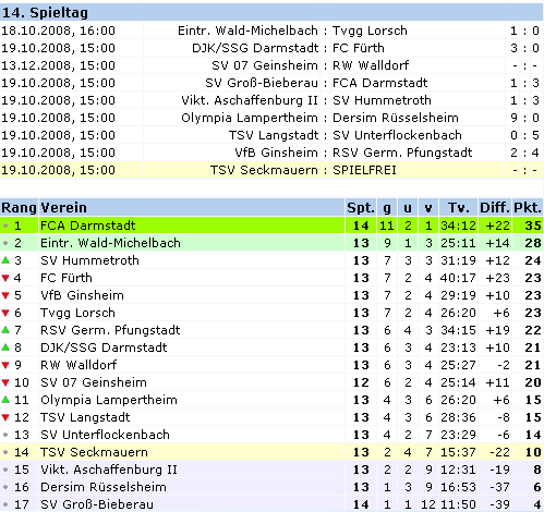 ![]() Nachholspiel am 13.Dez 2008 (Tabelle siehe Spieltag 21) SV Geinsheim - RW Walldorf 0:0 (Bericht siehe weiter unten) (aus echo-online.de) Befreiungsschlag bleibt aus Gruppenliga: Groß-Bieberau spielt „nicht schlecht“, verliert aber auch gegen Tabellenführer FCA Darmstadt – DJK/SSG und Pfungstadt überraschen, Langstadt rutscht nach 0:5 ab Kein schlechtes Spiel, aber auch kein Befreiungsschlag: Der SV Groß-Bieberau verlor gegen Spitzenreiter FCA Darmstadt mit 1:3 und bleibt Tabellenletzter der Fußball-Gruppenliga. Die DJK/SSG Darmstadt (3:0 gegen Fürth) und Germania Pfungstadt (4:2 in Ginsheim) überraschten, während der TSV Langstadt gegen Unterflockenbach mit 0:5 verlor und in Richtung Tabellenende rutscht. SV Groß-Bieberau – FCA Darmstadt 1:3 (1:2) TSV Langstadt – SV Unterflockenbach 0:5 (0:3) VfB Ginsheim – Germania Pfungstadt 2:4 (1:2) DJK/SSG Darmstadt – FC Fürth 3:0 (1:0) Uygut trifft dreimal FC Olympia Lampertheim: Neudahm, Pah (ab 70. Härtel), Zweininger, Pineker, Rimer, Müller, Simon (ab 62. Hofmann), Fenzel, Schader, Kley (ab 75. Bieniek), Uygut. Tore: 1:0 Uygut (3.), 2:0 Schader (5.), 3:0 Müller (12.), 4:0 Schader (20.), 5:0 Fenzel (31.), 6:0 Pineker (60.), 7:0 Uygut (63.), 8:0 Uygut (67.), 9:0 Müller (87.). – Zuschauer: 100. – Schiedsrichter: Gronenberg (Weißkirchen). – Bester FCO-Spieler: Uygut. Dersim-Abwehr ein Torso – 0:9 Aber auch so geriet die Pleite schmerzhaft genug für die Rüsselsheimer, die zum wiederholten Mal wie ein Absteiger spielten. „Etwas unglücklich gelaufen“ sei die Partie aus Gästesicht obendrein, fand ein FCO-Sprecher. Denn die drei ersten Schüsse hätten allesamt zu Toren geführt. Werten wir diese Worte als Höflichkeit des Gastgebers. Aber es wäre vermessen, eine 0:9-Niederlage mit Pech erklären zu wollen. In der Tat war die Abwehr des Tabellenvorletzten ein Torso, das die Olympia-Fußballer zum Toreschießen einlud, ließ der FCO-Sprecher durchblicken. Dersim-Torhüter Marcel Diehl, an den neun Gegentreffern schuldlos, konnte einem Leid tun. Auch die Offensive der Gäste bot eine indiskutable Leistung. Keine einzige Aktion, welche die Bezeichnung „Torchance“ verdient hätte, gelang dem Team aus der Opelstadt. Noch zwei Stunden nach dem Schlusspfiff war der Spielertrainer des SV Dersim, Hüseyin Top, ratlos. Völlig verkrampft sei seine Mannschaft gewesen. „Wir haben das Spiel heute im Kopf verloren“, sagte Top. Scheinbar seien die vielen jungen SV-Fußballer der Situation, gegen den Abstieg kämpfen zu müssen, nicht gewachsen. In den nächsten Tagen werde der Vorstand, dem Top ebenfalls angehört, über das weitere Vorgehen beraten. Es sei klar, dass dabei auch die bisherige Arbeit des Spielertrainers in Frage gestellt werden müsse. SV Dersim: Diehl – Cal, Singh, Demirel, Hassoun, Erdogan, Zidan (82. Gök), Top, Hameed, Mehmet Yildirim (82. Bakir), Anuk (46. Ceprail Coskuner). Tore: 1:0 Uygut (3.), 2:0 Schader (5.), 3:0 Müller (12.), 4:0 Schader (20.), 5:0 Fenzel (31.), 6:0 Pineker (60.), 7:0 Uygut (63.), 8:0 Uygut (67.), 9:0 Müller (87.). Schiedsrichter: Grunenberg (Weiskirchen). Zuschauer: 100. Mit Arzbach kommt Stabilität Dem „starken Fußballer“ Arzbach sprach der Trainer allerdings ein „Riesenlob“ aus. Vor allem die Mittelfeldaktionen gewannen mit der Rückkehr des ehemaligen Oberligaspielers, der zwei Monate verletzt war, an Dynamik. Der 34 Jahre alte Arzbach präsentierte sich agil und gewann die Mehrzahl seiner Zweikämpfe gegen „technisch und taktisch starke Lorscher“, so Eintracht-Vorsitzender Peter Bihn. Wie wichtig Arzbach für das System der ETW ist, wurde am Samstag ab der 60. Minute deutlich: Mit dem kräftemäßigen Einbruch Arzbachs Mitte der zweiten Halbzeit verflachte auch das Spiel der Gastgeber, die nach einem Tor von Florian Heid in der 17. Minute in Führung gegangen waren. Die Gäste aus Lorsch kamen vor allem über die Außenbahnen zu Chancen. Die beste vergab Monachello, der an ETW-Schlussmann Kai Arras scheiterte (68.). Für Tvgg-Trainer Walter Laue war es die beste Möglichkeit seiner Mannschaft in einem Spiel, das seiner Ansicht nach keinen Gewinner verdient hatte: „Wir hätten einen Punkt holen können“. Eintracht Wald-Michelbach: Arras, Lauer, Mucha, Sigmund (ab 74. Magel), Harbarth, Hansch, Arzbach, Cermjani, Besic, Savanovic, Heid (ab 75. Lipusch). Tvgg Lorsch: Rausch, Frimmel, Schellhaas, Schönberg, Keil (ab 74. Müller), Hartmann (ab 79. Frick ), Grimm, Mazzeo, Dulyapaphatsorn, Schwob, Monachello. Tor: 1:0 Heid (17.). – Zuschauer: 250. – Schiedsrichter: Seitz (Kalbach). – Beste Spieler: Arzbach/geschlossene Leistung. SV Hummetroth schon auf Platz drei Die Mannschaft von Trainer Amir Imsirovic kontrollierte am Aschaffenburger Schönbusch weitgehend das Geschehen auf dem Platz, ließ sich aber in der elften Spielminute durch einen Konter der Platzherren überraschen. Ugur Öner lief allein auf das Tor zu und traf zum 1:0. Hummetroth antwortete wenig später mit dem kernigen Distanzschuss von Fatih Yakut, den der Viktoria-Keeper Florian Madl mit Glanzparade abwehrte (18.). Der Ausgleich fiel durch die einstudierte Freistoßvariante, bei der Ali Sadik seinen Teamkollegen Daniel Leifermann in Szene setzte und gegen dessen Kopfball Madl keine Abwehrchance hatte (28.). Eine Schrecksekunde hatten die Gäste unmittelbar vor dem Pausenpfiff von Schiedsrichter Markus Finke (Fulda) zu überstehen, als Timo Heuss bei einem hohen Ball unterlaufen wurde und mit Kopf und Rücken auf den Boden prallte, zum Glück aber weiterspielen konnte. Kurz nach dem Seitenwechsel folgte das 2:1 durch Dennis Klein für den SVH: Das zwölfte Saisontor des Mittelstürmers war fast eine Kopie seines Treffers gegen Lampertheim, als er einem unachtsamen Verteidiger den Ball abknöpfte, allein aufs Tor zulief und in diesem Fall Madl überwand (49.). Beim 3:1 der Hummetröther durfte Robin Beisel zum erstenmal in dieser Spielzeit jubeln, als er nach einer scharfen He