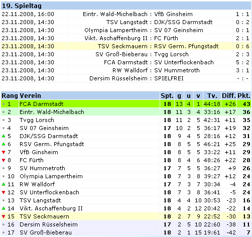 TSV Seckmauern - Germ. Pfungstadt 0:6 (0:4) Tore: 0:1 Hauke (18.), 0:2 Göksal (20.), 0:3 Meixner (25.), 0:4 Zeidler (26.), 0:5 Zinngrebe (52.), 0:6 Hauke (68.) TSV Seckmauern: Schäfer – Burak (85. S.Hartmann) - Thiel (49. Löffler) - Verst – Stapp - Berger (40. Henkes) - G.Hartmann – Bairam - Olt – Krejtscha – Seifert Germania Pfungstadt: Grosch – Huber – Zinngrebe –Klauck – Huxhorn – Schmidt – Meixner (73. Hübner) – Göksal (66. Hadi) – Zeidler – Hauke – Böck (46. Ruppert) Schiedsrichter: Christian Appel (ESV Elm) // Zuschauer: 100 Man hatte sich so viel vorgenommen beim TSV – und dann so was. Kurz nach dem Seitenwechsel besaß Bairam in einer 1:1-Situation mit dem TW die Chance zum Anschlusstreffer, doch es sollte heute nicht sein (48.). Kurz danach musste auch noch Libero Thiel humpelnd vom Platz. Nach dem 0:5 in der 52. Minute (wieder Kopfball nach Ecke) ließ Pfungstadt etwas die Zügel schleifen, Seckmauern hatte jetzt mehr Ballbesitz, die klareren Chancen verzeichneten weiterhin die Gäste. Nachdem Ruppert (57.), Hauke (60.) und Hadi (61.) ihre Möglichkeiten vergaben machte Hauke mit dem 0:6 Seckmauerns erneutes Debakel perfekt machte. Seckmauern bemühte sich bis zum Schluss, aber ohne Fortune. Schüsse von Henkes (73.) und zweimal Burak (75./78.) verpassten ihr Ziel relativ knapp, auch Seiferts Kopfball ging über das Tor (80.). Gegen Ende hatte Pfungstadts Hauke das 0:7 auf dem Fuß, doch der heute bedauernswerte TW Schäfer rettete hier (88.). Fast mit dem Schlusspfiff setzte sich Krejtscha energisch am rechten Flügel durch, statt aber quer zu passen hielt er aus spitzem Winkel drauf, für TW Grosch kein Problem (90.). Für Pfungstadt bleibt Seckmauern der Lieblingsgegner. Selten hat ein Gegner den TSV in zwei Spielen so beherrscht wie die Germania. In beiden Spielen blieb Seckmauern ohne jede Chance. Eigentlich dachte man, dass die abwehrschwachen Zeiten des TSV vorbei sind, aber Unterflockenbach (5 Gegentore) und das heutige Spiel belehren uns eines besseren. Jetzt heisst es kühlen Kopf bewahren. Sicher ist: die drei Absteiger und der Relegationsplatz machen derzeit die letzten fünf Vereine unter sich aus. Noch ist für Seckmauern nichts verloren. Aber es wird immer enger.wa (aus echo-online.de) Nach 26 Minuten ist schon alles vorbei Dabei wäre den ersatzgeschwächten Odenwäldern (es fehlten die verletzten Florian Canbolat und Florian Kislinsky) fast ein Auftakt nach Maß gelungen. Kaum 60 Sekunden nach dem Anpfiff des nicht immer sicher leitenden Unparteiischen Christian Appel (Elm) beförderte Mirco Olt einen Einwurf weit in den Gästestrafraum. Germania-Keeper Reni Grosch griff am Ball vorbei, doch ein Abwehrkollege rettete in höchster Not vor dem einschussbereiten Marcus Krejtscha. Das war es allerdings auch schon mit der Seckmaurer Herrlichkeit an diesem Tage. Pfungstadt übernahm auf dem schwer zu bespielenden Untergrund die Initiative und ließ in der Folgezeit der Heimelf nicht mehr den Hauch einer Siegchance. Schon nach 17 Minuten die Führung für die Germania, als Ingo Hauke per Kopf eine Ecke verwertete. Sichtlich geschockt unterliefen den Platzherren Stellungsfehler in Serie, und das nutzten die ambitionierten Gäste schnell zum 2:0: Erneut war Hauke frei, doch diesmal bediente er punktgenau Mitspieler Alper Göksal (20.). Nun war genau das passiert, was TSV-Trainer Theo Sahm unter allen Umständen vermeiden wollte – ein schneller Rückstand. Die Odenwälder verloren jede Ordnung in ihren Aktionen, was die Gäste weidlich ausnutzten und schnell vollendete Tatsachen schufen. Zunächst profitierte Florian Meixner von einem Abpraller des ansonsten guten TSV-Torhüters Markus Schäfer: Der Ball fiel dem Gästespieler vor die Füße, und der traf zum 3:0 (25.). Nur eine Minute danach war die Partie mit Patrick Zeidlers 4:0 endgültig entschieden. Die Germania ließ danach Ball und Gegner laufen und hatte jederzeit das Heft in der Hand. Seckmauern reagierte nur noch, war stets nur zweiter Sieger gegen den in allen Belangen überlegenen Aufsteiger. Sahm reagierte früh und brachte für Innenverteidiger Carsten Berger Stürmer Max Henkes (34.), doch auch das beeindruckte den Gegner nicht im Geringsten. Nach dem Seitenwechsel steckten die Gäste etwas zurück, waren aber immer Herr der Lage. Seckmauern gab zwar nicht auf, doch alle Versuche endeten beim bestens positionierten Gegner. Bei einer spektakulären Rettungsaktion verletzte sich zudem auch noch TSV-Libero Christian Thiel, und Pfungstadt nutzte die kurzzeitige Unordnung in der Abwehr eiskalt zum 5:0 durch David Zinngrebe aus (51.). Jetzt verflachte die Partie zusehends, weil die Germania nicht mehr tun wollte und Seckmauern sich nicht steigern konnte.l. Dennoch tauchte der Gast immer wieder gefährlich vor dem Tor der Seckmaurer, ging jetzt aber schludrig mit seinen Chancen um. Trotzdem reichte es noch zum 6:0 durch Mohammed Hadi (69.). Erst in den Schlussminuten gestaltete Seckmauern das Spiel wieder etwas offener, auch weil die Germania den Platzherren nun etwas mehr Platz ließ. Doch nur der agile Ercan Burak nutzte die so entstandenen Freiräume mit zwei schönen Weitschüssen, die knapp am Gästetor vorbeistrichen (76./77.). Das waren dann auch schon die besten Szenen des TSV in der zweiten Halbzeit, die der Schiedsrichter etwas zu früh abpfiff. Ohne wesentliche Formverbesserungen in nahezu allen Mannschaftsteilen geht Seckmauern schweren Zeiten entgegen. Sollte das Team weiter so auftreten wie gestern, scheint der Klassenerhalt in der Gruppenliga kaum realisierbar. TSV Seckmauern: Schäfer, Verst, Berger (34. Henkes), Gabriel Hartmann, Bayram, Stapp, Burak (83. Simon Hartmann), Thiel (55. Löffler), Olt, Krejtscha, Seifert. Zuschauer: 150 Groß-Bieberaus Misere hält an FCA Darmstadt – SV Unterflockenbach 5:2 (2:1) SV Groß-Bieberau – Tvgg Lorsch 2:3 (1:3) TSV Seckmauern – Germania Pfungstadt 0:6 (0:4) TSV Langstadt – DJK/SSG Darmstadt 0:2 (0:2) Blackout