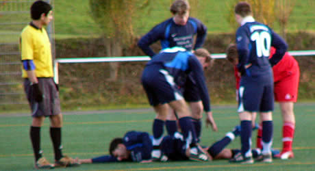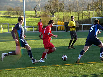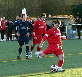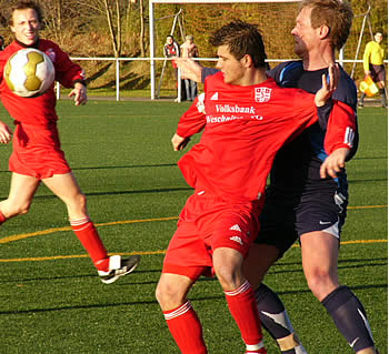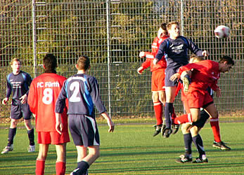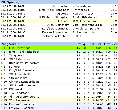 usw. – sie alle erwischten einen rabenschwarzen Tag. Aber auch das ist Kneißl: abgezockt wie er nach der Pause den Elfmeter zum 3:0 herausholte (53.). Als vier Minuten später Seifert im gegnerischen Strafraum ebenfalls gefoult wurde war klar, dass es auch hier Elfmeter geben würde. Stapp verwandelte sicher zum 3:1. Praktisch im Gegenzug erzielte Cin wieder den alten Abstand – wunderbar bedient von wem, genau – von Kneißl. Seckmauern ergab sich klaglos. Es gelang wenig bis nichts. Kein Zug nach vorne und hinten unterliefen immer wieder mal haarsträubende Fehler. Libero Hartmann spielte Cin den Ball in die Beine, allein vor TW Schäfer reagierte dieser Klasse, der Abpraller landete bei Kneißl – 5:1 (65.). Damit erzielte Fürth in Unterzahl 3(!) Tore (Becker erhielt kurz nach dem Wechsel die gelb/rote Karte). Unglaublich. Danach passierte das Drama um Bairam, der so unglücklich stürzte, daß ihm dabei die Knieschneibe heraussprang (73.). Kurz vor dem Ende erzielte Max Henkes mit einem abgefälschten Schuss das 5:2 (85.). Wenige Sekunde vor dem Schlußpfiff wusste Kneißl an der Strafraumlinie nicht wohin mit dem Ball, da setzte er einfach mal einen Kunstschuss an, der dann auch tatsächlich noch im Tordreieck des Seckmäurer Gehäuse landete – 6:2 (89.).wa (aus www.echo-online.de) Erneut eine deftige Niederlage TSV-Berichterstatter Uli Wagner sah „ein sehr schwaches Spiel“ seiner Mannschaft. Fürth war von Beginn an präsent. Wenig Engagement und immer wieder haarsträubende Abspielfehlern der Odenwälder spielten der Heimelf dazu noch in die Karten. Schon dem Führungstreffer in der 12. Minute ging ein Fehlpass von Mannschaftskapitän Manuel Seifert voraus, aus dem Fürths Angreifer Özcan Cin clever Kapital schlagen konnte. Erst nach einer halben Stunde fanden die Seckmaurer in die Partie, waren kurzzeitig sogar optisch in etwa gleichwertig, ohne jedoch zwingend zu agieren. Doch diese Phase endete mit einem eklatanten Abspielfehler Gabriel Hartmanns, der dem Fürther Top-Stürmer Florian Kneißl den Ball direkt in die Beine spielte, und der ließ sich das Geschenk nicht entgegen, schoss gekonnt zum 2:0 ein (40.). Damit war kurz vor dem Pausenpfiff des Unparteiischen Dariusch Taher (Windecken) eigentlich schon die Vorentscheidung gefallen. Die Zuschauer aus Seckmauern, die nach dem Wiederanpfiff ein Aufbäumen ihrer Elf erwartet hatten, wurden enttäuscht. FC-Akteur Mathias Becker sah nach 47 Minuten die Gelb-Rote Karte, so dass die die Gastgeber damit numerisch unterlegen waren. Es spielte aber weiter nur der FC, der schon in der 52. Minute zum 3:0 kam. Kneißl kam im Gästestrafraum zu Fall, den fälligen Elfmeter verwandelte er selbst. Fünf Minuten später eine ähnliche Szene im 16-Meter-Raum gegenüber, und auch hier zeigte der Referee auf den Punkt: Christian Stapp verkürzte zum 3:1 (57.). Doch schon in den verhaltenen Torjubel hinein die frühe Entscheidung durch Cin, der von einer Unachtsamkeit der TSV-Abwehr profitierte (58.). Danach war so gut wie jedes Aufbäumen bei den Gästen erloschen, sie knüpften nahtlos an die schwache Leistung des Vorsonntags an (0:6 gegen Germania Pfungstadt). Für das personelle Gleichgewicht sorgte Florian Kislinsky, der in der 74. Minute mit Gelb-rot vom Platz musste. Einen weiteren Aussetzer nutzte der an diesem Tage überragende Kneißl zum 5:1 (65.), ehe Max Henkes eine eher glückliche Resultatsverbesserung gelang, denn sein Schuss wurde noch von FC-Libero Stefan Keindl entscheidend abgefälscht (85.). Den Schlusspunkt zum 6:2 setzte Kneißl (89.). Es läuft wieder im Sturm So verkürzte der TSV in der 53. Minute nach einem Foul von Stefan Keindl per Strafstoß auf 1:3. Beim 2:5 war FC-Abwehrspieler Keindl ebenfalls behilflich, als er den Ball über die Linie des eigenen Tors bugsierte (85.). Zuvor aber traf die Mannschaft von FC-Trainer Thomas Felber in gewohnter Manier. Özcan Cin und Florian Kneißl waren erneut Garanten für den Erfolg. In der 13. Minute eröffnete Cin den Fürther Torreigen mit seinem 1:0. Nach einem Foul an Kneißl traf der Gefoulte selbst zum 3:0 (53.), nachdem der FC-Stürmer fünf Minuten vor der Pause auf 2:0 erhöht hatte (40.). „Fürth war heute überlegen. Einziges Manko: die Chancenverwertung“, bilanzierte Hechler. Denn in der Schlussphase nutzten die Odenwälder ihre Möglichkeiten nicht gegen eine verwundbare Abwehr des TSV Seckmauern. Nach der Gelb-Roten Karte gegen Becker agierten die Gastgeber ab der 47. Minute in Unterzahl und offenbarten selbst in dieser Phase keine Schwächen. „Fürth war von Beginn an die spielbestimmende Mannschaft“, erkannte Hechler. FC Fürth: Iacono, Zeiß, Keindl, Meister, Cabezas, Cin, Heckmann, Bauer (ab 70. Strauß), Arras (ab 70. Michel), Becker, Kneißl. Tore: 1:0 Cin (13.), 2:0 Kneißl (40.), 3:0 Kneißl (53., Foulelfmeter), 3:1 Stapp (57., Foulelfmeter), 4:1 Cin (58.), 5:1 Kneißl (63.), 5:2 Keindl (85., Eigentor), 6:2 Kneißl. – Schiedsrichter: Taher (Windecken). – Zuschauer: 250. – Besondere Vorkommnisse: Gelb-Rot gegen Becker (47./FC) wegen Meckerns und gegen Kiskinskiy (74./TSV) wegen wiederholten Foulspiels. – Beste FC-Spieler: geschlossene Leistung. Zwei frühe Tore helfen „Das Ergebnis ist verdient“, attestierte ETW-Pressesprecher Lothar Strusch dem Team, denn Walldorf kam erst nach der Roten Karte gegen Christian Bauer (61.) ins Spiel. So musste Sascha Harbarth in der zweiten Hälfte auf der Linie klären. Auf der Gegenseite vergab Almedin Besic eine Möglichkeit (33.). Kurz nach der Pause sorgte Hansch nach Zuspiel von Sigmund allerdings für die Vorentscheidung (3:1/49.). „Wir haben mit 2:0 geführt, das Anschlusstor kam aus dem Nichts“, so ETW-Spieler Eisenhauer, dessen Mannschaft das Projekt Aufstieg vorerst ohne ihn bewerkstelligen muss. Denn im Spiel gegen die DJK/SSG Darmstadt zog sich Eisenhauer einen Kreuzbandriss zu, nachdem er einen Schlag aufs rechte Knie erhalten hatte. Morgen muss sich Eisenhauer in Heidelber
