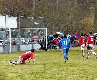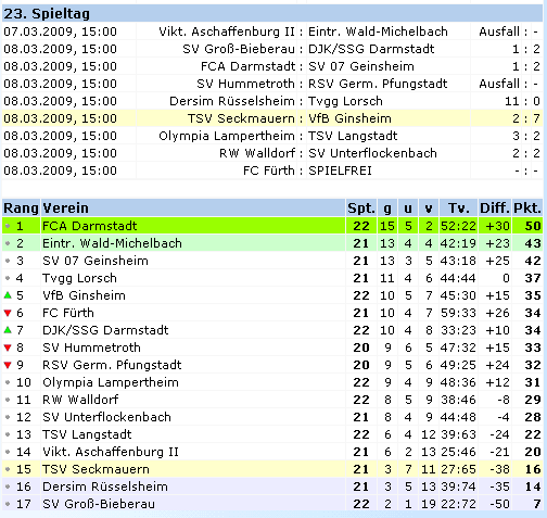 F. Canbolat (60. Stapp) - Olt – Krejtscha – Löffler Schiedsrichter Christoph Eschmann (SV metitzia Roth) - Zuschauer: 200 Nach dem Sieg in Darmstadt ging Seckmauern mit vielen Hoffnungen in diese Begegnung. Nach Spielschluss waren alle wieder auf dem Boden der Tatsachen angekommen. So wie sich Seckmauern in der zweiten Halbzeit präsentierte spielen Absteiger. Schon nach wenigen Sekunden musste TW Schäfer einen Weitschuss von Belhadj zur Ecke abwehren. Nach dem abgefangenen Eckball spurtete im Gegenzug Berthold in eine Vorlage von Krejtscha, TW Treffinger holte ihn von den Beinen und Schiedsrichter Christoph Eschmann pfiff Elfmeter. Thiel verwandelte sicher zur 1:0-Führung (2.). Ein idealer Auftakt für Seckmauern. Und der TSV spielte weiter nach vorne. Berthold kam nach zwei Steilvorlagen jeweils knapp zu spät. Mit fortschreitender Spieldauer sah man, dass mit Ginsheim eine Mannschaft auf dem Platz stand, die ein gutes Kombinationsspiel aufzog. Der TSV versuchte dies mit viel Laufarbeit und Kampfeinsatz zu unterbinden. Überraschend dann der Ausgleich, als nach einer flachen Hereingabe in den 5m-Raum der heute indisponierte F.Canbolat den Ball Aygurlu in die Füße spielte, der sagte „Danke“ und schob ein (9.). Im Gegenzug stand Krejtscha goldrichtig, als TW Treffinger einen Fernschuss von Burak nicht festhalten konnte und Krejtscha zur vermeintlichen 2:1 Führung einschob, das Tor wurde wegen Abseits aber nicht anerkannt. Nur 5 Minuten später stand F.Canbolat nach schöner Ballstafette mit Löffler frei, aber auch knapp im Abseits (25.). Der Führungstreffer der Gäste war ein weiteres Geschenk von der heute konfusen TSV-Abwehr. Jetzt patzte TW Schäfer. Giorlas Freistoß aus 20m ließ er abprallen und Trippel staubte ab (30.). Im Gegenzug der Ausgleich durch Hartmann, der den Ball nach einem 40m-Freistoß von Olt in den 5m-Raum ins Tor nickte. Hier machte Ginsheims Abwehr ebenfalls keinen souveränen Eindruck. Genau wie in der 35. Minute, als der heranbrausende Löffler nach einer Hereingabe den Ball aus 8m über das leere Tor schoss, vorangegangen war ein mustergültiger Angriff des TSV. Ginsheim spielte aber weiter den gefälligeren Fußball. Zittern musste man beim TSV immer wieder, wenn die beiden Außenverteidiger der Gäste, Pommer und Ritz, hohe Flanken in den Strafraum schlugen, dann herrschte oft heilloses Durcheinander bei den Mannen um Libero Thiel. Fünf Minuten nach der Pause besaß Hartmann die Gelegenheit zur 3:2-Führung. Nach der flachen Hereingabe in den Strafraum von F.Canbolat kam der Ball zum freistehenden Hartmann, doch anstatt selber zu schießen legte er 5m vor dem Tor zu ungenau Krejtscha auf – vorbei war die Chance. Besser machte es zwei Minuten später Ginsheim: Kureks weiter Freistoßball köpfte Damar unbedrängt vom langen Eck aus ein – 2:3 (52.). Ein Aufbäumen Seckmauerns nach dem Treffer war nicht auszumachen. Die Gäste kontrollierten weiter das Spiel ohne sich jedoch zu diesem Zeitpunkt große Tormöglichkeiten zu erarbeiten. Stapp vergab nach 65 Minuten per Freistoß aus 16m noch eine Chance für den TSV. Zu schwach aber sein Schuss. Das war´s dann endgültig mit der Herrlicjkeit Seckmauerns. Die Anspiele in die Spitze kamen überhaupt nicht mehr an, ein Fehlpass reihte sich an den anderen. Die cleveren Gäste nutzten dies schonungslos aus. Innerhalb von drei Minuten brach das Unheil über Seckmauern herein. Es war etwas für das Guiness-Buch der Rekorde: drei Tore in drei Minuten, wobei Dilg mit dem 2:4 ein richtiger Sonntagsschuss gelang. Das war schon harter Tobak, auch für die schon einiges an Tristess gewohnten TSV-Spieler. Ein Fehler „schöner“ als der andere. Bis auf wenige Ausnahmen stellten bei Seckmauern nun alle das Fußballspielen ein. Für den Rest der Spielzeit (20 Minuten) wurde man von Ginsheim gnadenlos vorgeführt. Ein sicheres Tor der Gäste vereitelte Verst, der einen Schuss vom völlig freistehenden Ritz auf der Torlinie abwehrte (85.). Kurz vor Spielschluss dann doch noch ein Tor des VfB. Der ausgespielte Thiel wusste sich gegen Lagerin im Strafraum nur per Foul zu helfen, Revich setzte mit dem 2:7 per Elfmeter das i-Tüpfelchen auf eine denkwürdige Begegnung. War das nun der (negative) Knackpunkt des TSV Seckmauern für den Rest der Saison? (aus www.echo-online.de) In der Defensive völlig überfordert Die Gäste legten auf dem schwer zu bespielenden Geläuf bei andauerndem Regen los wie die Feuerwehr: schon nach 60 Sekunden musste TSV-Torhüter Markus Schäfer sein ganzes Können aufbieten bei einem Weitschuss von Said Belhad. Beim direkten Gegenzug foulte VfB-Keeper Bastian Treffinger den durchgebrochenen Benjamin Berthold im Strafraum, was Referee Christian Eschmann (Roth) mit Strafstoß ahndete. Allerdings hätte der Unparteiische bei korrekter Regelauslegung den Ginsheimer Torhüter wegen offensichtlicher Notbremse auch des Feldes verweisen müssen – wohl ein folgenschwerer Fehler, wie sich noch zeigen sollte. Zunächst aber ließ sich TSV-Libero Christian Thiel diese Chance nicht entgehen und verwandelte sicher zum 1:0 (2.). Das nicht nachlassende Engagement des VfB wurde dann auch schnell belohnt durch den Ausgleichstreffer, den Aytekin Aygurlu markierte (15.). Vorausgegangen aber war ein eklatanter Fehler von TSV-Akteur Florian Canbolat, der nach einer flachen Hereingabe von der rechten Seite den Ball einem Meter vor der Torlinie – Schäfer lag aufnahmebereit schon auf dem Boden – nicht wegschlug, sondern praktisch kurz für Aygurlu auflegte. Ginsheim bot trotz der widrigen Platzverhältnisse einen technisch guten Fußball, aber die Platzherren überzeugten, angetrieben von Neuzugang Benjamin Berthold – durch hohen kämpferischen und läuferischen Einsatz. Nach einer kurzweiligen halben Stunde mit offenem Schlagabtausch erhielten die Gäste erneut ein Geschenk, als nämlich Schlussmann Schäfer einen eher harmlosen Freistoß abprallen ließ und Florian Trippel den Ball über die Linie dr