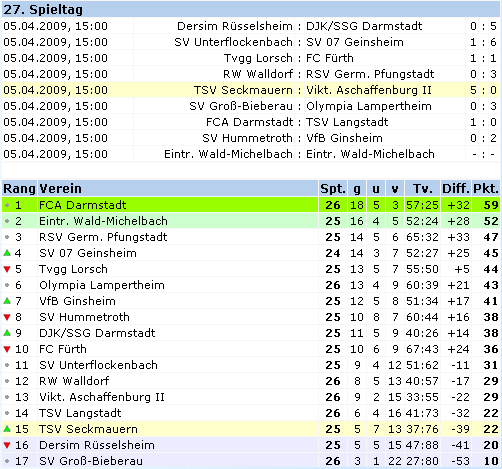 Raitz) - Olt – Seifert (72. Sirin) – Krejtscha (76. Henkes) Schiedsrichter: Mattias Kristek (KSV Aulendiebach) -- Zuschauer: 180 In der Halbzeit der Begegnung sah es nicht nach dem klaren Sieg aus. Knackpunkt des Spiels war der Elfmeterpiff von Schiedsrichter Kristek (KSV Aulendiebach), der Seckmauern anschließend die 2:0-Führung und Aschaffenburg vollständig aus dem Konzept brachte. 15 tolle Minuten reichten dem TSV dann für einen nie für möglich gehaltenen 5:0-Sieg gegen das Reserveteam von Viktoria Aschaffenburg. Aschaffenburg trat in Seckmauern mit einem ganz jungen Team an, welches noch mit vier Spielern aus der U19 aufgefüllt wurde; aus dem engeren Regionalliga-Kader waren nur Alexander Waimert und Sascha Herröder dabei. Selbst der 41jährige Trainer Jürgen Bleistein stand von Anfang an auf dem Platz. Diesmal erhielt die Reserve also keine nennenswerte Hilfe von „oben“. Unter der Woche hatte Wald-Michelbach nicht so großes Glück. Trotzdem nahm Aschaffenburg sofort das Spiel in die Hand und als Kislinskiy den Ball vertändelte vergab Linares eine große Gelegenheit (4.), im Gegenzug legte sich der wieder mitwirkende Seifert nach langem Pass von Burak den Ball zu weit vor. Manus (AB) verzog mit dem Rücken zum Tor stehend aus der Drehung (8.) und ein Schuss aus 16m von Aschaffenburgs Bestem, Tolka Ünlü, ging knapp am Tor von TW Simon Hartmann vorbei (10.). Aschaffenburg war in den ersten 20 Minuten klar die tonangebende Mannschaft. Alle Spieler, technisch versiert, spielten sie gut zusammen, kamen aber selten gefährlich vor das Seckmäurer Gehäuse. Der TSV stand hinten gut gestaffelt, operierte meist unkonventionell und mit langen Bällen. Die brachten aber mehr Gefährlichkeit als die ganze Aschaffenburger Fußballkunst. Nach 20 Minuten wusste Krejtscha offenbar nicht, wie viel Zeit er noch gehabt hätte, als er einen langen Pass von Thiel frei annahm, aber überhastet abschloss. Nur eine Minute später vergab Seifert eine 100%ige, als er nach einem Freistoß von Olt frei vor TW Kolke auftauchte, diesen aber anschoss (21.). Aufpassen musste zwischendurch TW Hartmann nach einem Heber aus 20m von Krapp (30.). Bei Seckmauern wurden immer wieder die längen Bälle hoch auf Krejtscha gespielt, der seinen bulligen Körper gut einsetzte, mit seinen Schüssen aber noch kein Glück hatte (34./40.). Fazit der ersten Halbzeit: eine insgesamt schwache Begegnung mit Chancenvorteilen für Seckmauern. Wenige Sekunden waren in der zweiten Hälfte gespielt, als Seifert einem sehr gut geschlagenen langen Ball nachlief und TW Kolke ihn im Strafraum regelwidrig von den Beinen holte. Während TW Kolke für das Foul die rote Karte erhielt, musste Seifert minutenlang behandelt werden. Thiel verwandelte den Elfmeter sicher zum 1:0 (49.). Im Gegenzug leistet sich Kislinskiy wieder einen gravierenden Fehler, Ugur Öner ging auf und davon, wurde aber noch so weit abgedrängt, dass sein Schuss keinen Schaden mehr anrichten konnte. Als Krejtscha nach 54 Minuten zusammen mit seinem Gegenspieler in den Strafraum eindrang und mit dem gerade eingewechselten Ersatztorwart Vogel kollidierte, pfiff der Schiedsrichter und deutete zur Überraschung vieler wieder auf den Elfmeterpunkt. Eine harte Entscheidung, da auch Krejtscha mit hohem Bein in den Zweikampf ging. Für sein Foul erhielt der TW allerdings nicht einmal die gelbe Karte. Hier ließ der Schiedsrichter die letzte Konsequenz doch vermissen. Thiel ließ sich davon nicht beeindrucken und erhöhte auf 2:0. Ab diesem Zeitpunkt war die Moral der Gäste dahin, die Elf brach auseinander, leistete keinen Widerstand mehr und stellte praktisch das Fußballspielen ein. Seckmauern konnte nun machen was es wollte. Es klappte jetzt fast alles. Auch die kurzen Zuspiele in die Spitze kamen an. Krejtscha legte quer auf Seifert, der umspielte noch den TW, wurde aber dann zu weit abgedrängt (66.). Nach einem Steilpass lief Krejtscha allein auf das Tor zu und schob überlegt am TW vorbei zum 3:0 (68.). Beim 4:0 gelang Burak ein toller Pass auf Berthold, der anschließend den Querpass auf den freistehenden Krejtscha spielte und dieser den Ball ins leere Tor unterbrachte (70.). Nach guter Ballstafette kam der Ball zu Bertholdt, der mit seinem Schuss von der Strafraumgrenze den Endstand zum 5:0 erzielte und dem damit sein erstes Tor für Seckmauern gelang (73.). Selten war der TSV in einem Gruppenliga-Spiel so dominant wie zu diesem Zeitpunkt des Spiels und das setzte sich bis zum Schlusspfiff fort. Obwohl wegen den Verletzungen vor den Elfmetern mindestens 6-7 Minuten Nachspielzeit anfielen, pfiff Schiedsrichter Kristek die Partie trotzdem pünktlich ab. Eine Besonderheit gab es aber dennoch zu vermelden: in der 84. Minute kam der A-Jugendliche David Raitz zu seinem ersten Einsatz in der 1A! Herzlichen Glückwunsch. (aus echo-online.de) Zweite Halbzeit als Wunschkonzert Gruppenliga: TSV Seckmauern hält gegen Aschaffenburg nur mit viel Glück ein 0:0 zur Pause, um dann noch 5:0 zu siegen Von Franz HoffmannIn der Fußball-Gruppenliga Darmstadt feierte gestern der TSV Seckmauern gegen Viktoria Aschaffenburg II mit 5:0 (0:0) seinen höchsten Saisonsieg und fuhr drei wichtige Punkte im Abstiegskampf ein. Wieder mit Kapitän Manuel Seifert an Bord, begannen die Platzherren zunächst sehr konzentriert und wollten die spielstarke Viktoria schnell in die Defensive zwingen. Doch schon die erste nennenswerte Gelegenheit für die Gäste zeigte die Schwächen in Seckmauerns Abwehr auf, bei der das Stellungsspiel Mängel aufwies. Von einem krassen Abwehrfehler von Florian Kislinskiy, der einen sicheren Ball vertändelte, profitierte David Linares, doch dessen Schuss wurde von Seckmauerns Ersatzkeeper Simon Hartmann zur Ecke gelenkt (4. Spielminute). Die Platzherren sahen sich in der Folgezeit mehr und mehr in die Defensive. Einziges Manko war die Chancenverwertung der Viktoria. Nur noch sporadisch gelang es dem TSV, zu durchdachten Aktionen zu kommen. Erst in der 22. Min