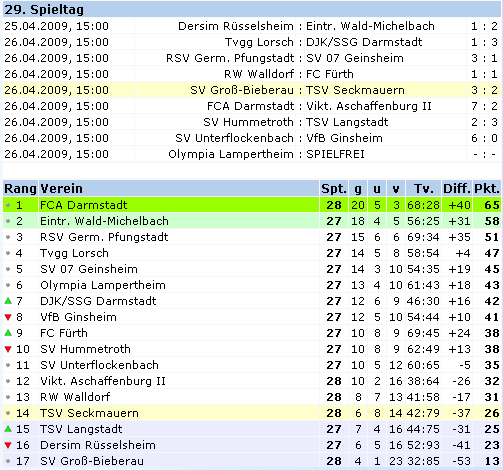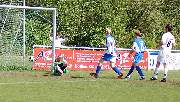 F. Canbolat (68. Sirin) – Seifert – Krejtscha Schiedsrichter: Krah (Meerholz) - Zuschauer: 150 Das Ergebnis schmerzt. Im Duell mit dem schon feststehenden Absteiger Groß-Bieberau unterlag Seckmauern mit 2:3, etwas unglücklich zwar (das Siegtor fiel erst in der Nachspielzeit), aber durchaus verdient, da es der TSV versäumte, schon vorher alles klar zu machen. Insgesamt gesehen war es ein schwaches, aber spannendes Spiel, in dem nur der verbissene Kampf Gruppenliga-Format hatte. Ehe sich Seckmauern versah, lag man 0:2 hinten. Für beide Tore zeichnete Groß-Bieberaus Kapitän und Sturmführer Frank Ester verantwortlich. Einen weiten Einwurf verlängerte er per Kopf ins Tor (4.), den zweiten Treffer staubte er ab, nachdem TW Schäfer einen 25m-Schuß von Manuel Santiago abprallen ließ (18.). Dies wäre dann der Hattrick von Ester gewesen, hätte er vorher einen Kopfball nach Ecke verwandelt und nicht den Ball direkt auf TW Schäfer platziert (12.). Kislinskiy kam überhaupt nicht mit diesem Spielertyp klar, erst als Trainer Sahm nach 15 Minuten Christian Verst zu diesem beorderte, gab es kaum noch Torgelegenheiten für die Hausherren. Auf dem kleinen, holprigen, ausgetrockneten Platz war nur schwer Fußball zu spielen. Der Ball sprang hoch und unkontrolliert ab. Mit ein Grund dafür, warum das Spiel der Marke „Kick and Rush“ ähnelte. Gelungene Spielzüge über mehrere Stationen fanden kaum statt. Seckmauern hatte ebenfalls seine Chancen, und die waren gar nicht schlecht. So versprang Seifert schon nach 2 Minuten im Strafraum der Ball, nach 13 Minuten hatte Olt eine so genannte 100%, als er frei vor TW Daab auftauchte, diesen erst anschoss und dann den Abpraller neben das Tor setzte. Nur drei Minuten später zielte Burak in aussichtsreicher Position direkt auf den Torwart. Kurz nach dem 2:0 trat Florian Canbolat im 5m-Raum über den Ball (19.), ein Drehschuss von Marcus Krejtscha verfehlte seine Ziel (23.) und Burak setzte nochmals einen Ball knapp neben das Tor (25.). Dann war es Seifert vorbehalten, den längst fälligen Anschlusstreffer zu erzielen, Olt war per Flanke der Vorlagengeber (30.). Seckmauern bestimmte das Spiel, war aber immer anfällig für die Konter der Gastgeber. Als Thiel den auf ihn zustürmenden Christoph Hörr im Strafraum auflaufen ließ, deutet der Schiedsrichter zum Unmut der Seckmäurer Fans auf den Punkt, doch TW Schäfer wehrte den Strafstoß von Ester ab und hielt Seckmauern weiter im Spiel (33.). Kurz vor dem Wechsel erzielte Krejtscha noch ein wegen Abseits nicht anerkanntes Tor (43.). Optimal ging es nach der Halbzeit für Seckmauern weiter. Wieder war Seifert zur Stelle, als er eine Hereingabe Olts zum 2:2 verwertete (52.). Und Seckmauern blieb weiter am Drücker. Groß-Bierberau war jetzt sichtlich angeschlagen. In der 55. Minuten belagerte der TSV regelrecht den Strafraum der Hausherren, der letzte Schuss von Benni Canbolat konnte dann endgültig abgeblockt werden. Berthold scheiterte mit einem tollen Solo erst an TW Daab (62.), ebenso Seifert nach gutem Zuspiel von Berthold (68.). Ein weiterer Höhepunkt war der 30m-Hammer von Mirco Olt, den TW Daab in letzter Not über die Latte lenkte (77.). Von Groß-Bieberau war nicht viel zu sehen, Seckmauern hatte die Partie im Griff. Als Kislinskiy nach 79 Minuten, fernab vom Spielgeschehen, völlig unmotiviert auf den am Boden liegenden Hörr trat, zeigte der Unparteiische dem TSV-Abwehrspieler zu Recht die rote Karte. Das war für das Seckmäurer Team sichtlich demotivierend. Hinzu kam, dass fast alle Spieler zu diesem Zeitpunkt am Ende ihrer Kräfte waren, auch ob der großen Hitze. Lediglich Burak stand noch zweimal im Brennpunkt des Geschehens: in der 80. Minute vergab er durch zu ungenaues Abspiel auf Seifert eine gute Gelegenheit und in der 86. Minute stoppte ihn nur noch TW Daab. Nach der Hinausstellung Kislinskiys deutete sich schon in einigen Szenen eine Unordnung in der Hintermannschaft Seckmauerns an. Die nutze Hörr die Nachspielzeit zum viel umjubelnden Siegtreffer für die Gastgeber, als er eine Kopfballvorlage von Ester verwertete. Ausgelaugt von den vorhergehenden 93 Minuten lagen viele Seckmäurer Spieler nach dem Schlusspfiff auf dem Boden oder verschwanden wortlos in der Kabine während die Spieler Groß-Bieberaus im Mittelkreis freudetrunken tanzten. Sechs Punkte wollte der TSV aus den vergangenen beiden Spielen holen, mit Glück ist es letztlich einer geworden. Obwohl rechnerisch noch alles möglich ist, kann jetzt nur der Relegationsplatz das Ziel sein, mehr wäre ein Wunder. wa (aus echo-online.de) Obwohl die Platzherren die Klasse nicht mehr halten können und bereits als erster Absteiger feststehen, begannen sie mit mehr Engagement und wurden schon nach vier Minuten dafür belohnt. Nach einer Ecke von Lars Adloff war Frank Ester per Kopf zur Stelle und brachte die Heimelf in Front. Ein absolut vermeidbarer Treffer, denn die Kopfballstärke des Bieberauer Angriffsführers war auch in Seckmauern hinreichend bekannt. Aber auch die Gäste blieben nicht ohne ihre Torchancen, und Mirco Olt hatte gleich zwei Mal den Ausgleich auf dem Fuße: Zunächst scheiterte er allein vor dem starken SV-Torhüter Sascha Daab, den Abpraller setzte er an den Außenpfosten (13.). Groß-Bieberaus Keeper war auch wenig später Endstation für Burak Ercan (16.). In alle Ausgleichsbemühungen der Odenwälder hinein dann die kalte Dusche. Als Manuel Santana aus gut 20 Metern völlig ungehindert abzog, konnte TSV-Torhüter Markus Schäfer den Ball nicht festhalten. Er fiel Ester vor die Füße, der ohne Mühe zum 2:0 einschoss (18.). Seckmauern zeigte sich ob des Rückstands nur kurz geschockt, übernahm mehr und mehr die Initiative, freilich ohne dabei spielerische Glanzpunkte zu setzen. Geprägt war die Partie von Fehlpässen hüben und drüben, sie lebte von den Fehlern der jeweiligen Kontrahenten. Erst ein raffiniert herein gedrehter Freistoß von Olt (29.) fand den Weg ins Tor der Heimischen. Ob dabei