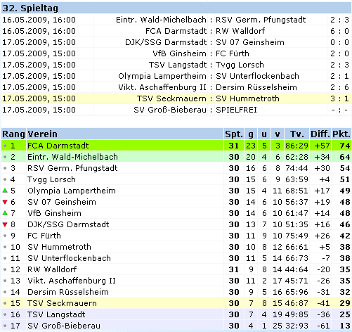 Hartmann - B.Canbolat - Olt (36. F.Canbolat) – Seifert – Krejtscha Schiedsrichter: Christian Irion (Vikt. Nidda) - Zuschauer: 250 Seckmauern gewinnt mit 3:1 – und verliert trotzdem, da gleichzeitig Konkurrent Dersim Rüsselsheim mit 6:2 bei Viktoria Aschaffenburg II siegreich bleibt. Damit sind die Chancen auf den Relegationsplatz nur noch theoretischer Natur. In den letzten beiden Spielen müsste Seckmauern noch zwei hohe Siege einfahren, einen davon schon nächste Woche in Rüsselsheim. Die Begegnung brachte viel, was man von einem Deby erwarten konnte. Es war ein spannendes, emotionsgeladenes und phasenweise auch ein packendes Spiel. Die Gäste aus Hummetroth waren weit davon entfernt, Gastgeschenke zu verteilen. Trotz des Fehlens von Sadik, Koch und Vendola standen jedoch immer noch genügend Hochkaräter in der Hummetröther Elf, die Fußball spielen können. Aber der Ball lief nur bis in Seckmauerns Strafraumnähe gekonnt durch die Reihen der Gäste, spätestens dann waren sie mit ihrem Latein am Ende. So mussten Weitschüsse und Freistöße für einen Erfolg herhalten, aber auch diese brachten nichts ein. Zu gut hatte Seckmauerns Abwehrverbund um den laufstarken Berthold die gegnerische Offensive unter Kontrolle. Seckmauern seinerseits kam mit zunehmender Spielzeit immer besser in Schwung. Nachdem ein zu schwacher Schuss des heute agilen Krejtscha TW Heuss keine Probleme bereitete (11.), konnte der TW fünf Minuten später nur mit größter Mühe das 0:1 verhindern, nachdem Krejtscha den Ball nach einer gut getimten Flanke von Berthold volley auf das Tor zog und Heuss den Ball noch vor Überschreiten der Linie wegboxte. Ein fataler Rückpass von Burak zwang TW Schäfer fast an der Torauslinie und knapp auf der Strafraumlinie zu einem Einsatz am flinken Rupcic, was ihm die gelbe Karte einbrachte (17.), der anschließende Freistoß von Leifermann war nicht von schlechten Eltern. Als TW Schäfer einen Schuss von Torjäger Dennis Klein in Klassemanier ebenso entschärfte wie den nachfolgenden Kopfball von Rupcic (19.) war´s das für lange Zeit von Hummetroth gewesen. Kreitscha verpasste im 5m-Raum der Gäste ganz knapp einen langen Ball von Thiel (20.) und Seifert scheiterte in einer 1:1-Situation an TW Heuss (25.). Nach einer Vorlage von Seifert erzielte Krejtscha dann die längst verdiente 1:0-Führung, als er seinen Gegenspieler im 5m-Raum mit einer Körpertäuschung ausspielte und den Ball unter TW Heuss ins Tor schob (31.). Und Seckmauern blieb weiter am Drücker. Nach einem klugen Pass von Hartmann auf den durchgebrochen Verst lief dieser allein auf TW Heuss zu, wurde aber noch eingeholt (36.). Danach musste Olt verletzt vom Platz. Erst in den letzten Minuten vor der Pause kam Hummetroth wieder etwas auf, aber Yakut (37.) und Beisel (40.) vergaben gute Gelegenheiten zum Ausgleich. Hummetroth startete gut in die zweite Halbzeit. Dennis Klein spielte TW Schäfer aus, aber der Winkel für einen Torerfolg geriet zu spitz (47.). Als Seifert von 2-3 Hummetröther Abwehrspielern im Strafraum in die Mangel genommen wurde und stürzte, gab der insgesamt schwache Schiedsrichter Irion Elfmeter. Thiel erhöhte sicher auf 2:0 (52.). Fast im Gegenzug verschätzte sich Benni Canbolat nach einem weiten Abschlag von TW Heuss, der Heber von Dennis Klein ging aber über das Tor. Das Spiel ging nun hin und her, war in dieser Phase völlig offen, wobei sich Hummetroth aber weiter keine nennenswerten Chancen erarbeiten konnte. Die Gäste zelebrierten technisch anspruchvolles Spiel mit wenig Zug zum Tor. Sirin war nur wenige Sekunden auf dem Platz, da erzielte er das vor entscheidende 3:0. Der freistehende Krejtscha nahm seinen Pass auf, lief bis zur Außenlinie, schob den Ball in die Mitte zum mitgelaufenen und freistehenden Sirin, der den Ball zwischen TW Heuss und Beser ins Tor schob (68.). Hummetroth lockerte jetzt seine Abwehr und Seckmauern bekam so mehrmals die Möglichkeit Konter auszuspielen. Doch jedes Mal übersah der Ball führende Spieler seinen besser postierten Nebenmann (Seifert, F.Canbolat). In der Zwischenzeit setzte Leifermann einen Freistpß an den Pfosten (77.). Gegen konditionell immer mehr nachlassende und in dieser Situation schlafmützige TSV-Spieler erzielte Yakut sechs Minuten vor dem Ende nach Freistoßvorlage von Leifermann das 1:3. Seckmauerns Akteure waren zu diesem Zeitpunkt zu keinem kontrollierten Spiel mehr fähig, droschen den Ball nur noch aus dem Abwehrbereich. Trotzdem bekamen Krejtscha und Hartmann in der Schlussminute noch die Gelegenheiten zum 4:1. Kreitschas Schuss in Bedrängnis ging neben das Tor und Hartmann, der frei auf TW Heuss zulief, hob den Ball über das Tor. Am Ende gewann Seckmauern aber auch in dieser Höhe verdient mit 3:1. wa (aus echo-online.de) Derbysieg wird von Dersim gekontert Fußball-Gruppenliga: Seckmauern trotz 3:1 gegen Hummetroth gefährdet – Rinnert wehrt sich gegen Rückzugs-Gerüchte Von Bernd KöblerDrei Punkten mussten her, und die sprangen am gestrigen Sonntag für die Fußballer des TSV Seckmauern in der Gruppenliga auch heraus: Mit 3:1 (1:0) entschieden die TSV-Kicker das Odenwälder Derby mit dem SV Hummetroth für sich. Doch unter den Hausherren wollte keine rechte Siegesfreude aufkommen, denn unmittelbar nach Spielschluss traf die ernüchternde Nachricht aus Aschaffenburg ein: Dort hatte der direkte Konkurrent Dersim Rüsselsheim mit 6:2 gewonnen und den Abstiegs-Relegationsplatz bei drei Zählern Vorsprung und dem wesentlich besseren Torverhältnis gegenüber Seckmauern weiter gefestigt. In Seckmauern trafen zwei völlig unterschiedliche Spielweisen aufeinander. Während Hummetroth mit seinem bevorzugten Kurzpassspiel insgesamt mehr Ballbesitz verzeichnete, versuchten es die Platzherren mehr mit langen Bällen. Dies ging in den Anfangsphase oft daneben und etliche Male lief ein TSV-Spieler ins Abseits. Dann aber kam Seckmauern zu Torchancen. Zunächst konnte Markus Krejtscha nach verunglückter Kopfballabwehr von