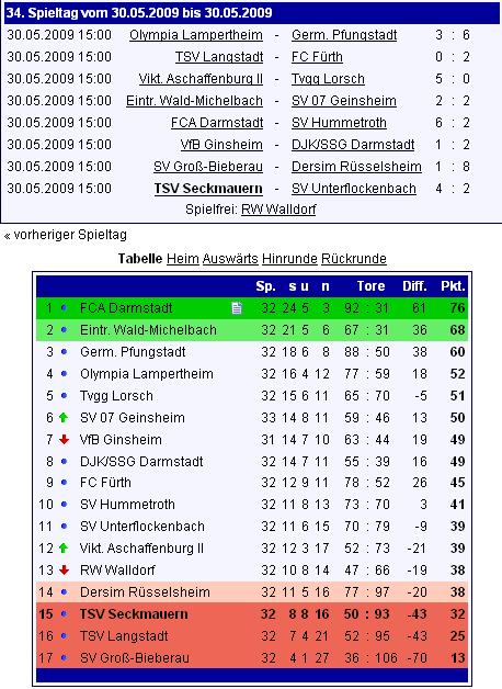 wurde auch schon ausgegeben – vier Wochen vor dem offiziellen Trainingsbeginn.wa Die Partie begann mit der Schusschance von Markus Krejtscha, der von der Strafraumlinie aus nur die Querlatte traf (6.). Wenig später hatten die Gäste mehr Glück: Hüseyin Manav nahm eine Flanke mit dem Rücken zum Tor mustergültig an und erwischte mit seinem Schuss aus der Drehung TSV-Keeper Markus Schäfer auf dem falschen Bein – 0:1 (9.). Dem folgte der Auftritt des stark auftrumpfenden Benjamin Berthold, der in der 13. Minute die gesamte Gästedeckung verlud und Manuel Seifert bediente, der den SV-Torhüter Andreas Götz anschoss – den abprallenden Ball setzte Berthold knapp neben den Pfosten. Doch in der 18. Minute fiel der Ausgleich: Wieder spielt sich Berthold auf der linken Seite bis zur Grundlinie durch, passt auf den freistehenden Krejtscha, und der hämmert die Kugel aus kurzer Entfernung in die Maschen. Nachdem Krejtscha den Unterflockenbacher Keeper Andreas Götz aus gut 20 Meter Entfernung prüfte (27.), musste auch der Seckmaurer Schlussmann Markus Schäfer zweimal gegen Izzet Acik sein ganzes Können aufbieten (34. und 36.). Zuvor strich ein kerniger Schuss von Gästeverteidiger Philipp Lammer aus fast 25 Meter hauchdünn über die Querlatte (20.). Dann kam SV-Keeper Götz gegen die durchgebrochenen Seifert und Krejtscha – wieder hatte Berthold den Spielzug eingeleitet – zu spät und holte gleich beide Spieler im Strafraum von den Beinen. Den fälligen Elfmeter verwandelte Christian Stapp sicher zum 2:1 (40.). Unterflockenbach verstärkte zu Beginn der zweiten Halbzeit die Offensivbemühungen, vor allem die beiden schnellen Spitzen Manav und Acik beschäftigten die TSV-Deckung, übertrieben aber bisweilen die Dribblings. In der 50. Minute stand Acik am Fünfmeterraum sträflich frei, musste aber bei seinem schwachen Abschluss die Hilfe von Christian Stapp in Anspruch nehmen, der den Ball irgendwie endgültig über die Linie bugsierte – 2:2 (50.). Seckmauern blieb die Antwort in Form des Treffers zum 3:2 nicht schuldig: Nach Vorlage von Seifert traf Berthold die Kugel drei Meter vor dem Tor nicht richtig, und der schon am Boden liegende Götz bekam den „Hoppelball“ einfach nicht zu fassen (55.). Jetzt waren die Gäste wieder an der Reihe, doch Schäfer zeigte sich beim Kopfstoß von Acik (56.) auf dem Posten. Und in der 60. Minute bewahrte der Seckmaurer Keeper sein Team mit seiner besten Aktion erneut vor dem Ausgleich, als er beim sehenswerten Alleingang von Ronny Sauer den Flachschuss des allein vor dem TSV-Gehäuse aufgetauchten SV-Mittelfeldspielers mit reflexartiger Fußabwehr parierte (60.). Den Unterschied machte in dieser munteren Partie die etwas bessere Chancenverwertung der Seckmaurer. So in der 73. Minute, als Mirco Olt von rechts gefühlvoll flankte und Krejtscha per Flugkopfball zum 4:2 ins Netz traf. Damit war die Partie gelaufen, auch wenn sich Acik (86.) und Manav (89.) noch zwei gute Gelegenheiten boten. Fazit: Ein gelungener Saisonausklang der TSV-Fußballer. Die Mannschaft will fast komplett zusammen bleiben und sich in einer hochinteressanten Kreisoberliga neue Ziele setzen. TSV Seckmauern: Schäfer – Stapp, Verst, Benjamin Canbolat, Florian Canbolat (65. Löffler), Burak (55. Kislinsky), Olt, Hartmann (75. Bartsch), Berthold, Seifert, Krejtscha. Zuschauer: 160. Des Trainers Lob für Phillip Lammer Tore: 0:1 Lammer (10.), 1:1 Krejtscha (21.), 2:1 Stapp (42./Foulelfmeter), 2:2 Manav (48.), 3:2 Berthold (50.), 4:2 Krejtscha (72.) – Schiedsrichter: Althoff (Egelsbach). – Zuschauer: 200. – Beste SVU-Spieler: Lammer, Yotat, Klein. Trotz Rückständen bestes Kreisteam Allerdings wollte beim Klub am Pfingstwochenende keine richtige Freude aufkommen. Vor der Begegnung war der langjährig aktive SV 07-Spieler und Mitglied des Spielausschusses, Reinhold Putzer, unerwartet verstorben. Anhänger und Spieler standen unter Schock. Dennoch zeigte die Mannschaft um Trainer Axel Vonderschmitt zum Saisonabschluss noch einmal eine ordentliche Leistung. Beim Relegationsteilnehmer, der in bester Aufstellung aufspielte, verdiente sich die Elf das Unentschieden. Trotz der hohen Temperaturen auf dem Wald-Michelbacher Kunstrasenplatz war der SV 07 über weite Phasen das bessere Team. Auch nach zweimaligem Rückstand nach der Pause gab das Geinsheimer Team die Partie nicht verloren und kam in der 77. Minute noch durch Marcel Berger zum 2:2-Ausgleichstreffer. Während der SV 07 Geinsheim in der nächsten Saison auf die Neulinge SKG Ober-Beerbach, SC Hassia Dieburg, VfR Fehlheim und Absteiger SG Dornheim trifft, gehören die Absteiger SV Groß-Bieberau, TSV Langstadt und TSV Seckmauern der Gruppenliga nicht mehr an. Der SV Dersim Rüsselsheim, FV Hofheim/Ried, SV Münster und FSV Schneppenhausen können sich ebenfalls noch einen Startplatz via Relegationsrunde erspielen. Höhepunkt kommt noch Et. Wald-Michelbach: Aufstiegsrelegation in den Köpfen, 2:2 gegen Geinsheim in den Beinen Der Fokus liegt auf der Relegation beim Verbandsliga-Aufstiegsaspiranten Eintracht Wald-Michelbach. Schon am Donnerstag (3.) kommt es zum ersten Spiel gegen DJK Bad Homburg auf neutralem Platz in Pfungstadt (19 Uhr). Die Überwälder erwartet ein Gegner, der in der Punktrunde kaum Gegentore zugelassen habe und eine stabile Mannschaft sei, wie ETW-Pressesprecher Lothar Strusch am Samstag nach dem letzten Punktspiel sagte. Gegen den SV Geinsheim reichte es für den Tabellenzweiten der Gruppenliga vor eigenem Publikum nur zu einem 2:2. Doch die Begegnung gegen den Sechsten geriet am Samstag zur Nebensache. „Der Höhepunkt der Saison kommt noch“, so Strusch mit Blick auf die Relegation. Eintracht Wald-Michelbach: Miske, Mucha Heiligenthal, Baucsek, Sigmund, Arzbach, Metz, Müller (ab 46. Cermjani, ab 80. Harbarth), Besic, Zingle, Heid (ab 58. Hansch). Tore: 1:0 Metz (5.), 1:1 Auer (57.), 2:1 Zingle (65.), 2:2 Berger (77./Foulelfmeter). – Schiedsrichter: Englert (Schwanheim). – Zuschauer: 12