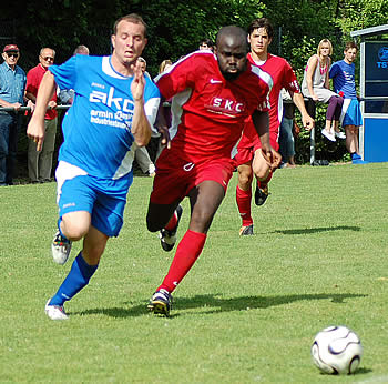 Bilder TSV Seckmauern: Schäfer, Verst, Bertholdt, Burak (55. Kislinskiy), Gabriel Hartmann (75. Bartsch), Benjamin Canbolat, Stapp, Florian Canbolat (63. Löffler), Olt, Krejtscha, Seifert SV Unter-Flockenbach: Götz – Lammer, Fandel, Jodat, Bugert, Saager (17. Klein), Metzger, Acik, Manav, Sauer, Akdagcik (31. Sternberger) Schiedsrichter: Alexander Althoff (SG Egelsbach) - Zuschauer: 150 In einem unterhaltsamen Spiel und mit einem 4:2-Erfolg ließ der TSV Seckmauern sein 2jähriges Engagement in der Gruppenliga Darmstadt ausklingen. Die Gäste aus Unterflockenbach, bei denen einige Stammspieler fehlten (Osswald, Murr, Kirschenlohr, Amallah), waren an diesem Tag ein dankbarer Gegner für den Abschluss einer, aus Seckmäurerer Sicht, unbefriedigend verlaufenen Saison, in der nicht unbedingt der Abstieg hätte stehen müssen. Vor dem Anpfiff verabschiedete Fussballabteilungsleiter Michael Hartmann Trainer Theo Sahm. Sahm, der die Mannschaft nach dem Aufstieg vor zwei Jahren von Holger Strothmann übernahm, führte das Team im ersten Jahr, trotz besseren Wissens vieler, zum rettenden Ufer. Den Abstieg in dieser Saison konnte auch er wegen vieler widriger Umstände leider nicht verhindern. Der TSV Seckmauern ist für den in Laudenbach wohnenden Übungsleiter die letzte Station einer langen Trainerkarriere. Spieler und Zuschauer lernten Sahm als erfahrenen, integeren und soliden Menschen kennen und schätzen. Mit ihm geht auch Rolf Hagendorf, der für die 1B verantwortlich zeichnete. Der TSV hofft, dass der Kontakt zu den beiden noch lange bestehen bleibt, wie bei all seinen Ex-Trainern in der Vergangenheit üblich. Nachfolger der beiden für die neue Saison werden bekanntlich Benjamin Bertholdt und Manuel Seifert. Nach dem Lattenschuss von Krejtscha (6.) erzielte der überaus agile Gästestürmer Manav aus einer harmlosen Situation heraus die Gästeführung. Mit dem Rücken zum Tor stehend nahm er eine Flanke auf, sein nicht einmal fester Drehschuss aus 16m ging zwischen Verst und TW Schäfer, den er auf dem falschen Fuß erwischte, hindurch zum 0:1 ins Netz (9.). Seckmauern ließ sich davon nicht beirren. Besonders Berthold riss durch beherzte Solis immer wieder Löcher in die Gästeabwehr. Nachdem er in der 13. Minute fünf Leute umkurvt hatte, setzte er in Höhe der Strafraumgrenze Seifert ein, der jedoch TW Götz anschoss, den Abpraller setzte Berthold knapp neben den Pfosten. Dem längst fälligen 1:1 ging wieder ein Sololauf von Berthold voraus. Er setzte sich vehement am linken Flügel bis in den 5m-Raum durch, schnippelte den Ball vor das Tor, Krejtscha stand frei und drosch zum 1:1 ein (18.). Krejtscha war es auch, der in der 27. Minute TW Götz mit einem Schuss aus 20m prüfte. Unterflockenbach hielt gut mit, besonders die beiden Sturmspitzen Acik und Manav waren immer gefährlichen. Glück für Seckmauern, dass sich diese meist zu spät vom Ball trennten und ihre Dribblings so wirkungslos verpufften. Nach einem Solo von Gästeverteidiger Lammers strich dessen Geschoß aus 25m knapp über die Latte (20.), Acik scheiterte zweimal mit seinen Schüssen an TW Schäfer (34./36.). Als Krejtscha und Seifert einem Pass von Berthold in den Strafraum hinterherliefen und über den herausstürzenden TW Götz fielen, pfiff Schiedsrichter Althoff Elfmeter. Stapp verwandelte sicher zur 2:1-Führung (40.). Das 3:1 vergab kurz vor der Pause Krejtscha, der nach guter Kombination die Ablage von Seifert knapp am Tor vorbeisetzte (44.). Unterflockenbach ging die zweite Hälfte sehr energisch an. Nachdem ein Schuss von Lammer knapp das Tor verfehlte, fiel der Ausgleich etwas unglücklich. Eine weite Flanke gegen eine zu offene TSV-Abwehr nahm Acik im 5m-Raum schön auf, sein allerdings zu lascher Schuss wurde von dem herbeieilenden Stapp endgültig ins Tor befördert (50.). Die Antwort von Seckmauern kam postwendend. Olt, von Stapp am rechten Flügel herrlich freigespielt, passte zu dem in der Mitte freistehenden Krejtscha, doch dessen Schuss wurde im letzten Moment abgeblockt (51.). Nur kurze Zeit später erzielte Berthold die 3:2-Führung. Von Seifert steil geschickt, setzte er sich energisch durch und sein Kullerball rollte zwischen Verteidiger und Torwart hindurch ins Tor (55.). In dieser Phase wogte das Spiel hin und her. Acik vergab per Kopf (56.), TW Schäfer rettete in einer 1:1-Situation gegen Sauer (60.). Dann war wieder Seckmauern an der Reihe. Der heute auffälligste Spieler, Bertholdt, legte für Krejtscha maßgerecht auf, nach zu viel Rücklage ging dessen Schuss aus 5m in die Wolken (64.). Besser machte es Krejtscha dann in der 73. Minute: nach Flanke von Olt markierte er freistehend und per Kopf das 4:2. Nun zog sich Seckmauern etwas zurück, Unterflockenbach konnte aus der optischen Überlegenheit allerdings keinen Vorteil mehr ziehen. Lediglich Acik (86.) und Manav (88.) besaßen noch Gelegenheiten zur Ergebnisverbesserung. Am Ende gewann der TSV verdient. Nach Spielschluss wurde trotz des Abstiegs gelassen der Rundenabschluss
