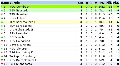 ![]() ![]() TSV II - TSG Bad König II 5:1 (2:1) 1:0 Thiel (9.), 1:1 Kienow (34.), 2:1 Thiel (39./FE), 3:1 Müller (47.), 4:1 Müller (55.), 5:1 Thiel (88.) Während die Gäste ihr optisches Übergewicht nicht in Tore ummünzen konnten und ihre wenigen Torchancen nicht nutzten, machte auf der anderen Seite Seckmauern Nägel mit Köpfen. Acht Torschüsse - fünf Tore. Sehr effektiv. Matchwinner war Christian Thiel, der drei Tore selbst erzielte und eines vorbereitete. wa