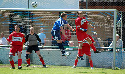 Alexander Wolfstädter mit einem Kopfball am Brensbacher Keeper. |