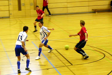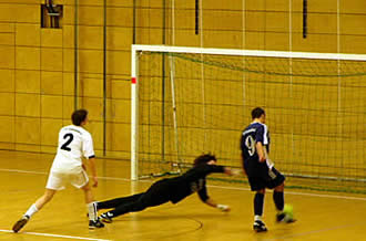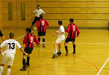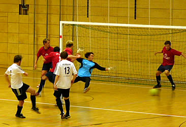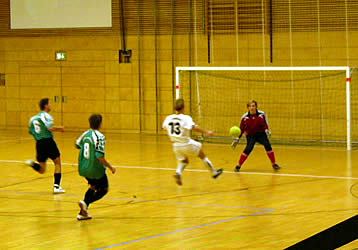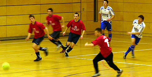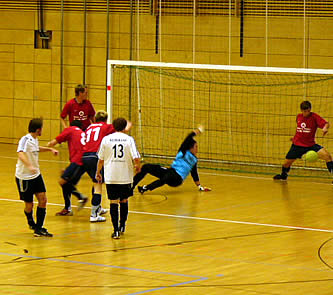 ( 3.-4. Jan 2009) Seckmauern gewinnt das Halbfinale gegen Erlenbach mit 3:1 und verliert das Finale 1:4 gegen Elsenfeld Kein Glück trotz jeder Menge Torgelegenheiten hatte Seckmauern in seinen ersten beiden beiden Spielen gegen Eichelsbach/Sommerau (0:3) und Kleinwallstadt (1:3). Erst gegen Großwallstadt platzte der Knoten, man gewann 5:1. Nach Siegen über Mömlingen (5:4) und Elsenfeld (3:1) stand man im Halbfinale dem Titelverteidiger Erlenbach gegenüber. In einem spannenden Spiel rang man den souveränen Tabellenführer der Gruppe 1 mit 3:1 nieder. Im Finale schlug dann Elsenfeld Seckmauern ein Schnippchen .... (mehr weiter unten) ![]() Das Bild links zeigt eine Szene aus dem Halbfinale gegen Erlenbach, bei dem TW Schreiber über sich hinauswuchs. Hier rettet G. Hartmann auf der Linie. |