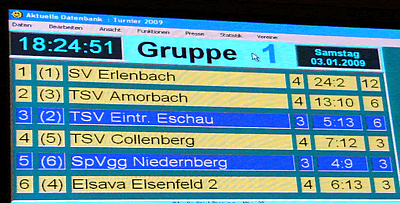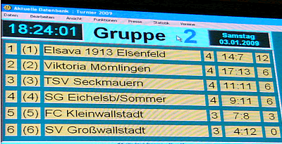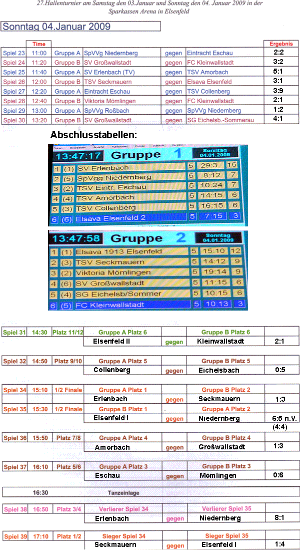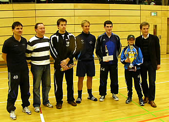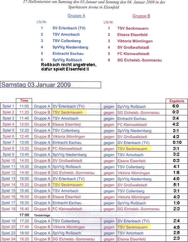 Spiele: TSV - Eichelsbach/Sommerau 0:3 Chancenverhältnis 10:3 für Seckmauern, doch der Gegner schießt die Tore TSV - Kleinwallstadt 1:3 Seckmauern läßt sich durch seine zu offensive Spielweise 3x überrumpeln, vergibt wieder klarste Tormöglichkeiten. Tor zum 1:2 durch Seifert TSV - Großwallstadt 5:1 Endlich platzt der Knoten. Großwallstadt ohne Chance Tore: Seifert 2, Kreitscha, Löffler, Olt TSV - Mömlingen 5:4 Mömlingen führt schnell mit 2:0. Als Burak den Anschlußtreffer erzielt spielt Seckmauern groß auf. Hartmann glänzt mit einem Zaubertor. Tore: Hartmann 2, Burak 2, Verst TSV - Elsenfeld 3:1 Eine überraschend eindeutige Angelegenheit für Seckmauern gegen schon qualifizierte Elsenfelder. Das Gegentor fiel erst kurz vor Schluß. Tore: Kislinkiy, Burak, Hartmann Halbfinale TSV - Erlenbach 3:1 Eine spannende Partie. Erlenbach führt nach drei Minuten 1:0 und verpasst in Folge diese Führung auszubauen. Nach Hartmanns Ausgleich kippt die Partie und Seckmauern erzielt nach dem Wechsel durch Olt zwei blitzsaubere Treffer. Im Tor wuchs Andy Schreiber über sich hinaus. Endspiel TSV - Elsenfeld 1:4 Alle Zeichen standen für Seckmauern auf Sieg (schon das Gruppenspiel gegen Elsenfeld gewonnen, Elsenfelds mühsamer Halbfinalsieg in der Verlängerung gegen Nierdernberg). Und man führte nach wenigen Sekunden durch Olt mit 1:0. Das machte Seckmauern allerdings nicht sicherer, im Gegenteil: man kam überhaupt nicht ins Spiel. Nichts lief bei Seckmauern. Da hatte es Elsenfeld einfach seine Tore zu erzielen. Tore (gesamt): Olt, Seifert, Hartmann je 4, Burak 3, Verst, Kislinkiy, Löffler, Kreitscha |
